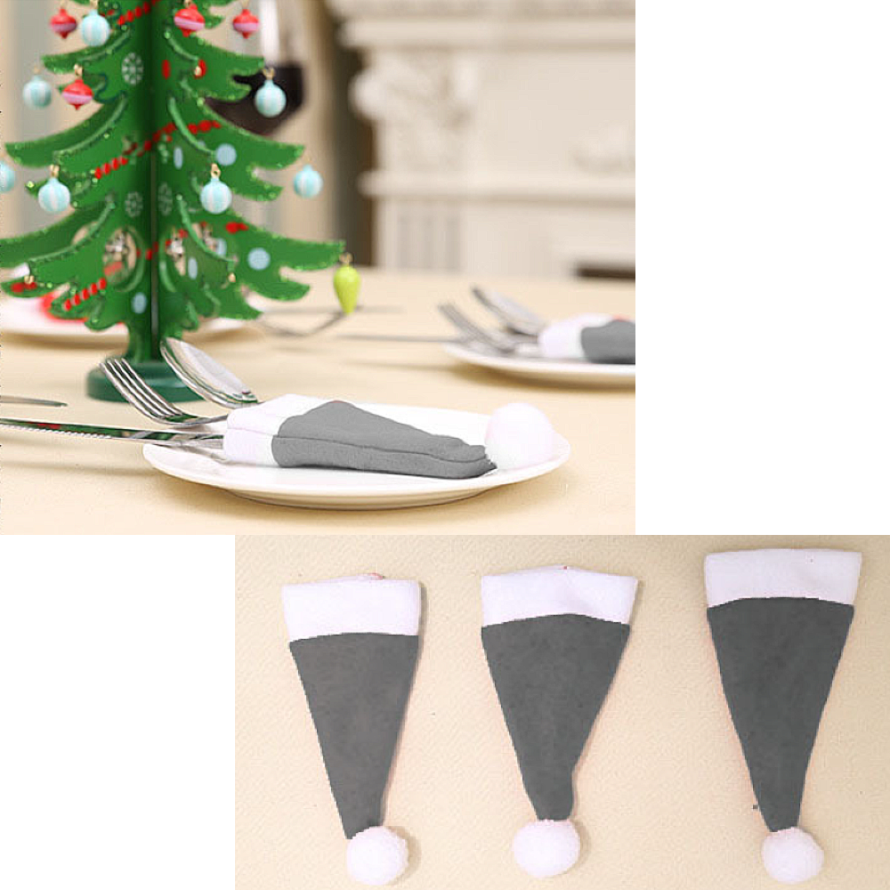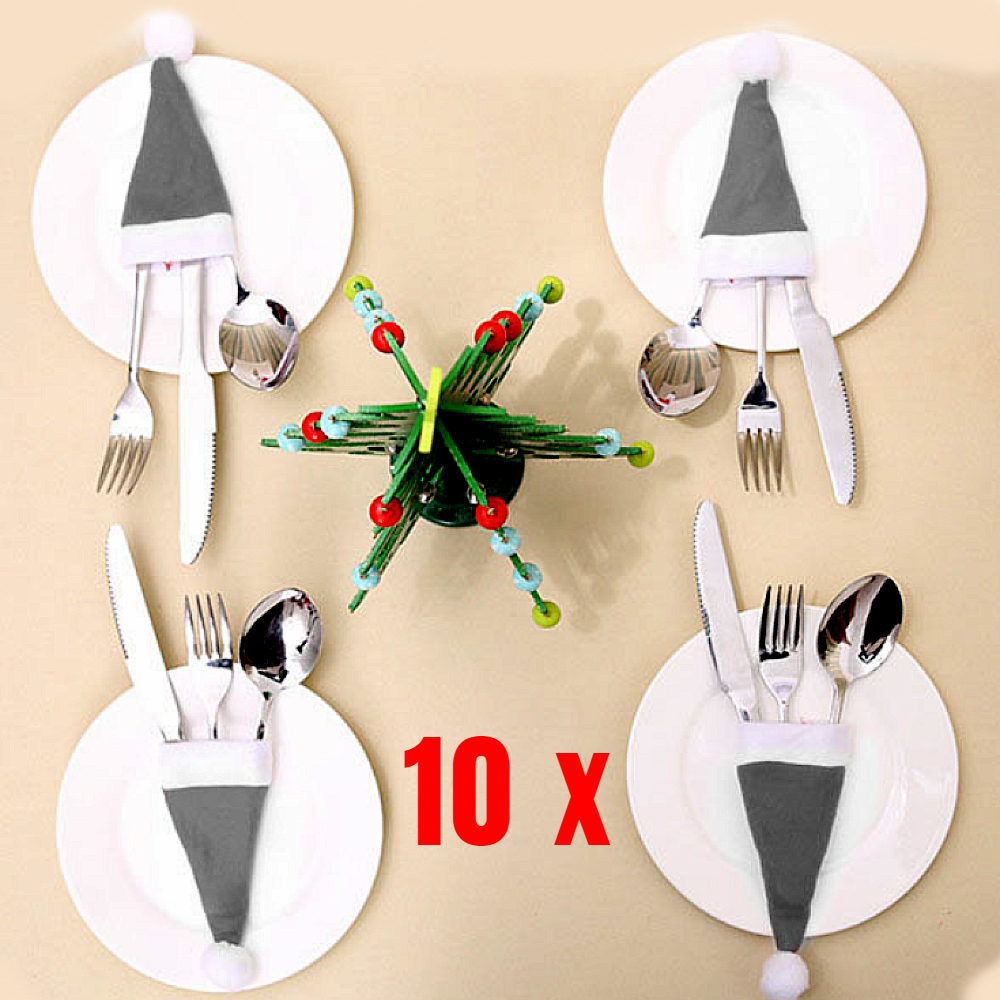 Allernieuwste.nl® 10 stuks Kerstmuts Bestekhouders Kerstdiner Tafeldecoratie Kerst - Mini Kerstmutsen - 10x Bestekhouder voor Kerstdagen - Wijnfles Decoratie- 12 x 6 cm Grijs Wit - Copy