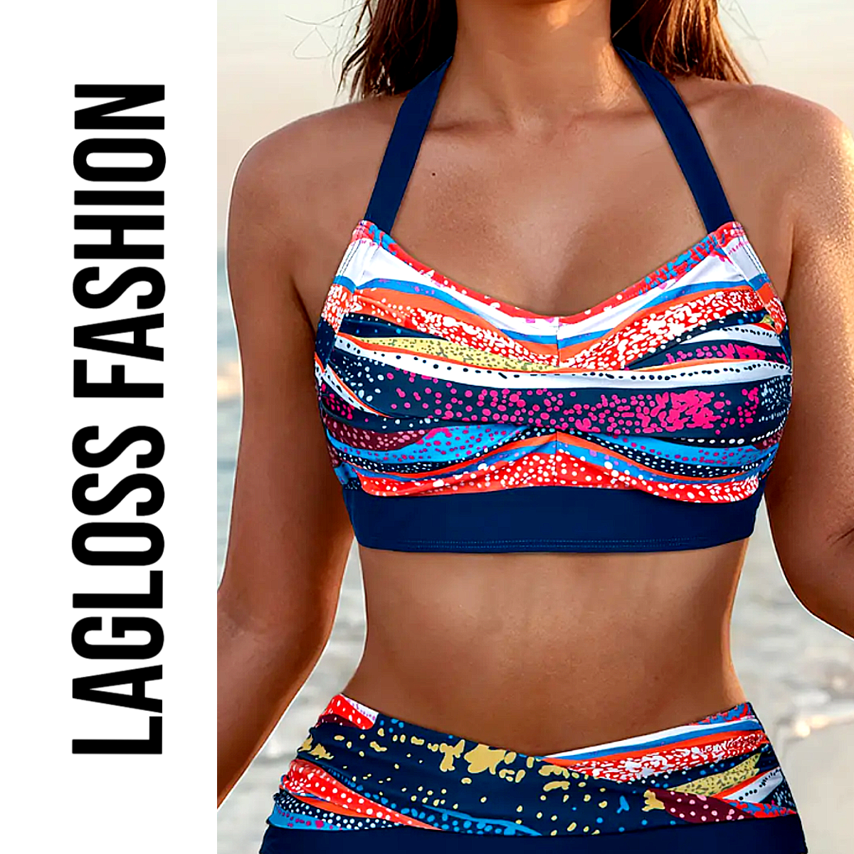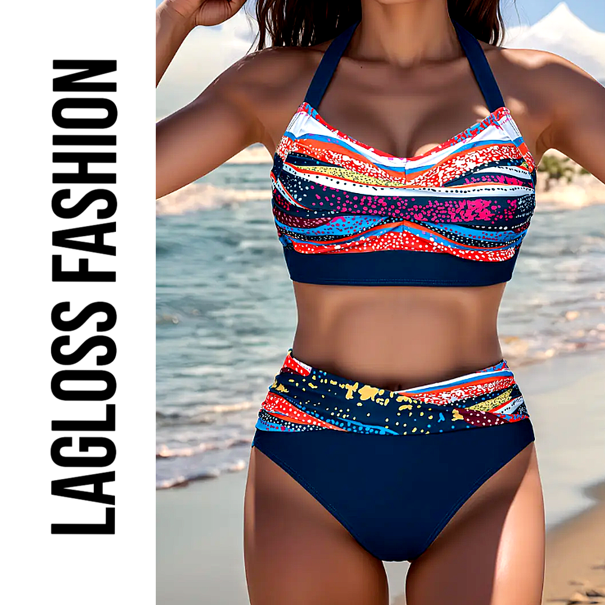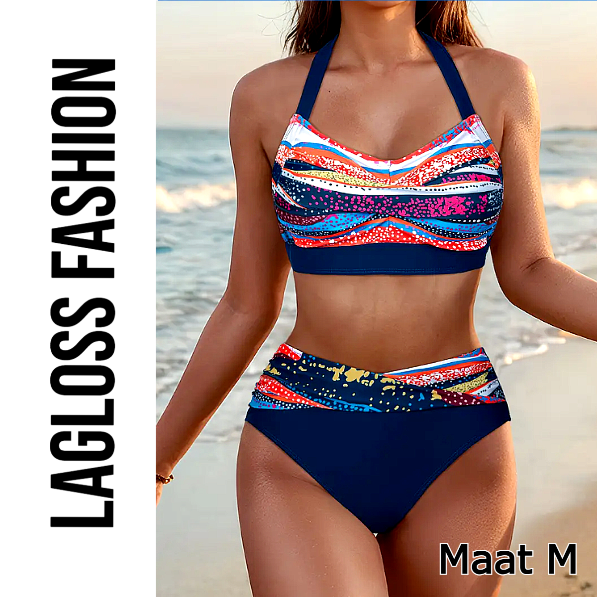 multicolor bikini dames, LaGloss bikini set, donkerblauwe bikini met print, halternek bikini plooien, 2-delige badmode maat M, comfortabele bikini zomer, kleurrijke bikini dames