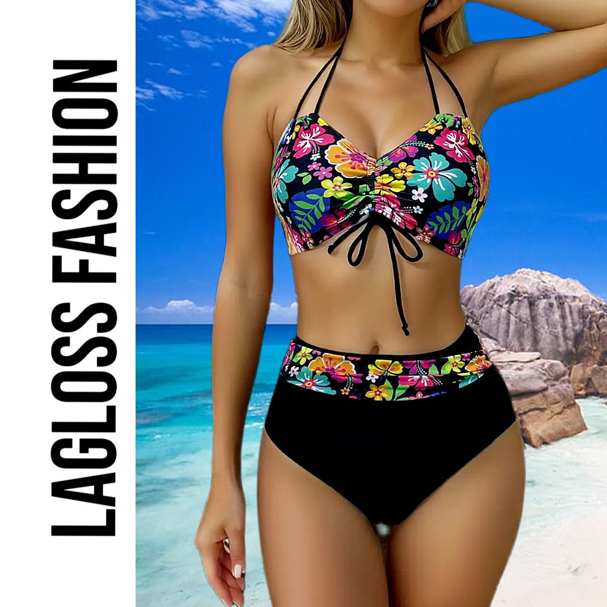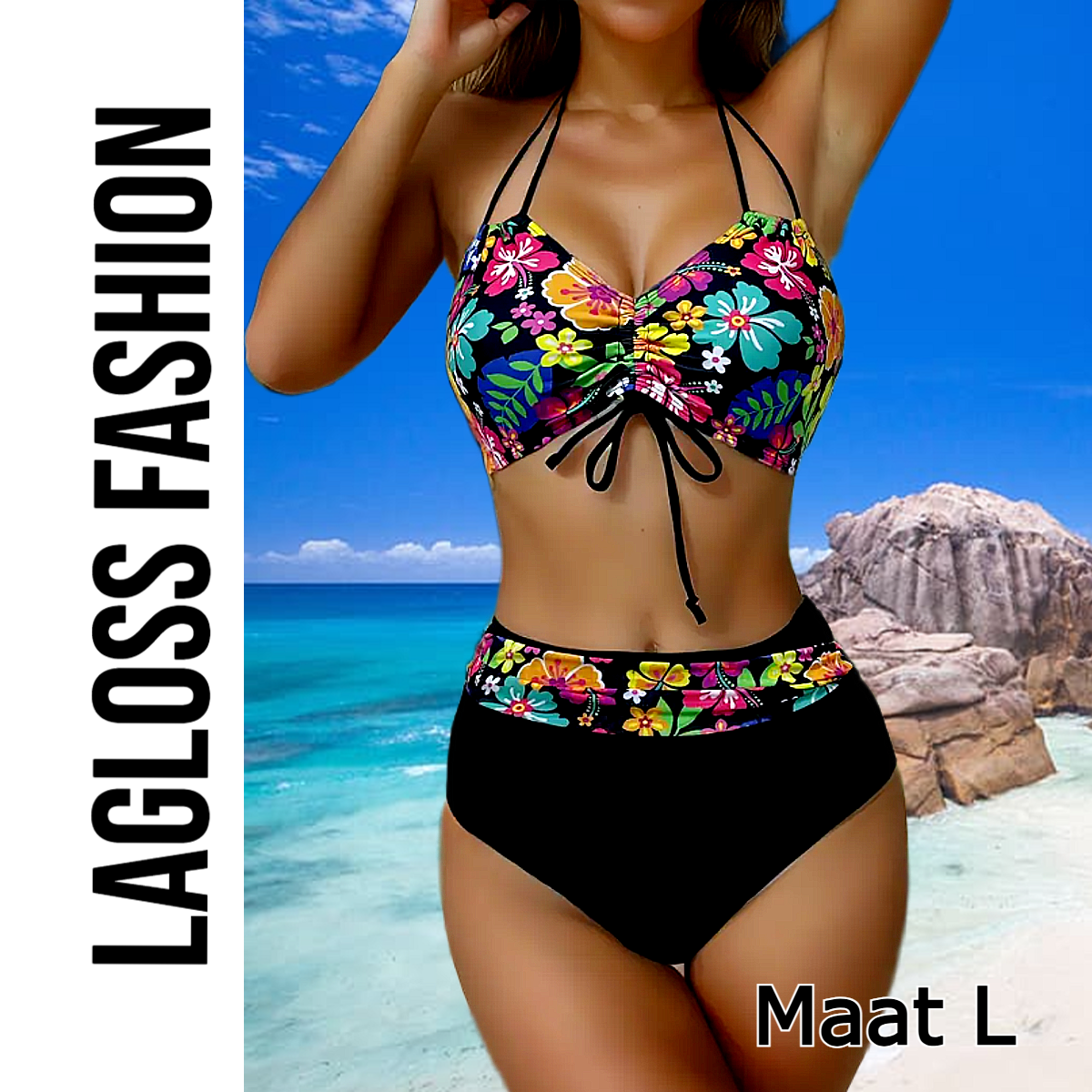 zwarte bikini bloemenprint, LaGloss bikini set maat L, 2-delige bikini hoge taille, bikini met strik top, flatterende dames badmode, bloemen bikini zwart, zomer bikini dames
