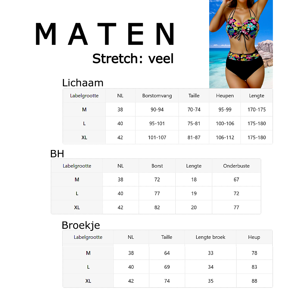 De bikini is vervaardigd uit een medium-stretch stof met 82% polyester en 18% elastaan, waardoor je verzekerd bent van een comfortabele pasvorm die met je meebeweegt. De elastische tailleband zorgt ervoor dat de bikini op zijn plaats blijft, zelfs tijdens zwemmen of sporten op het strand.