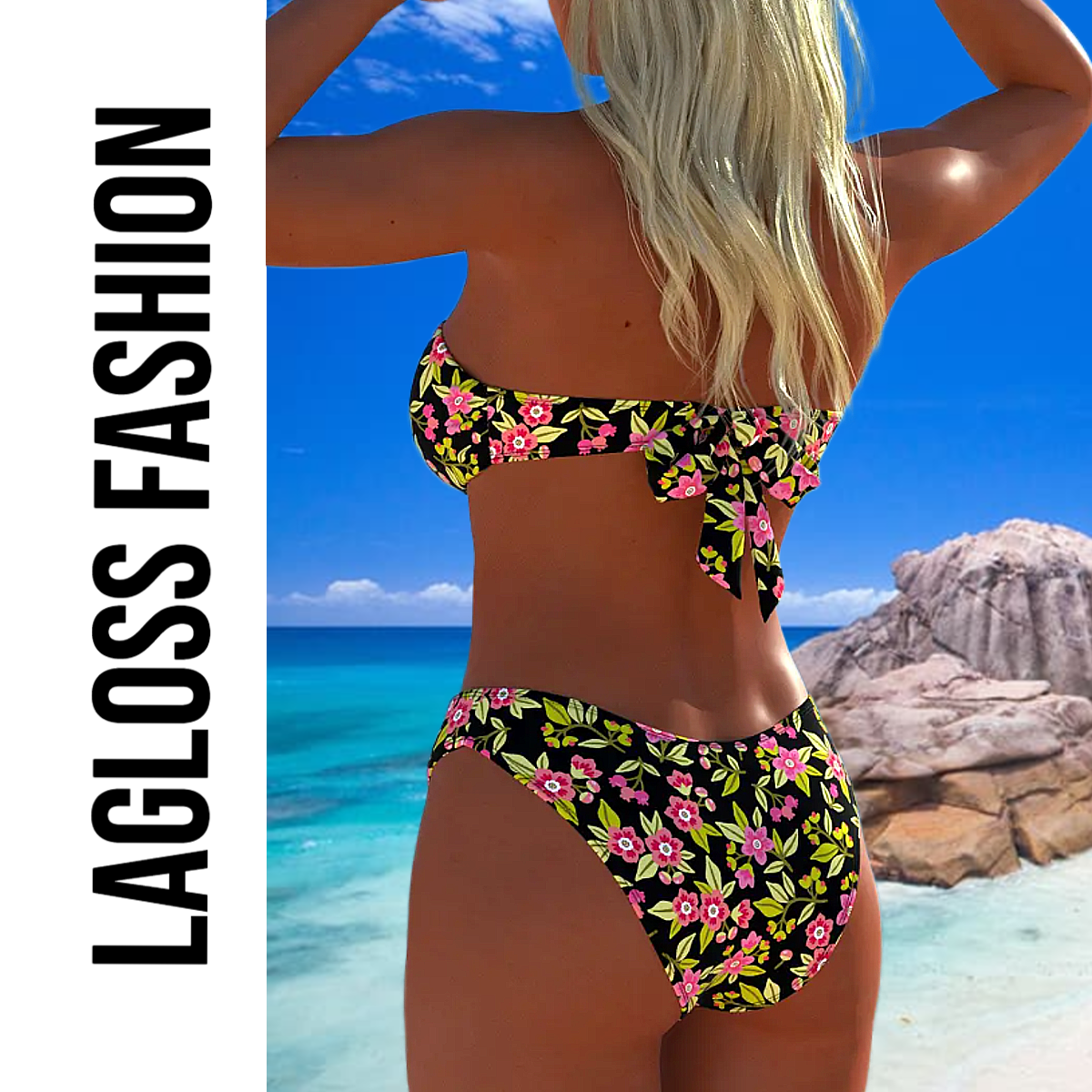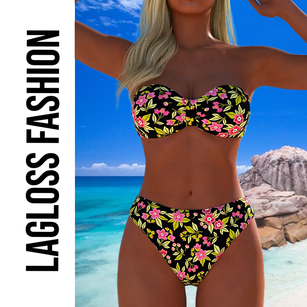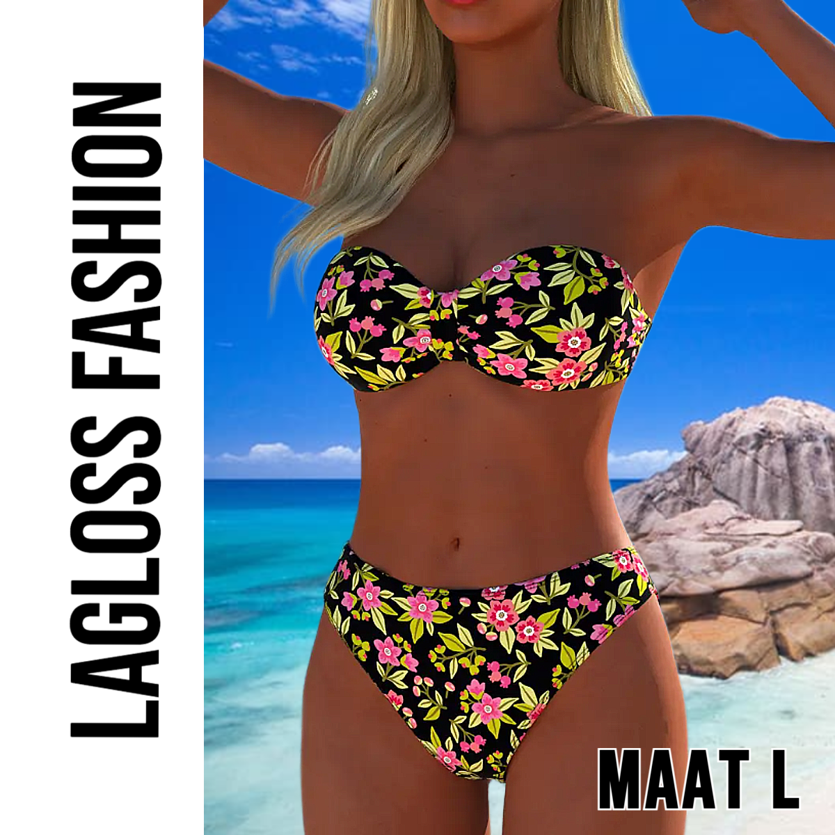 LaGloss® Trendy Strapless Bikini Set – 2-delige Bloemenprint Badmode voor Dames – Strapless Top & Bikini Slip – Maat L