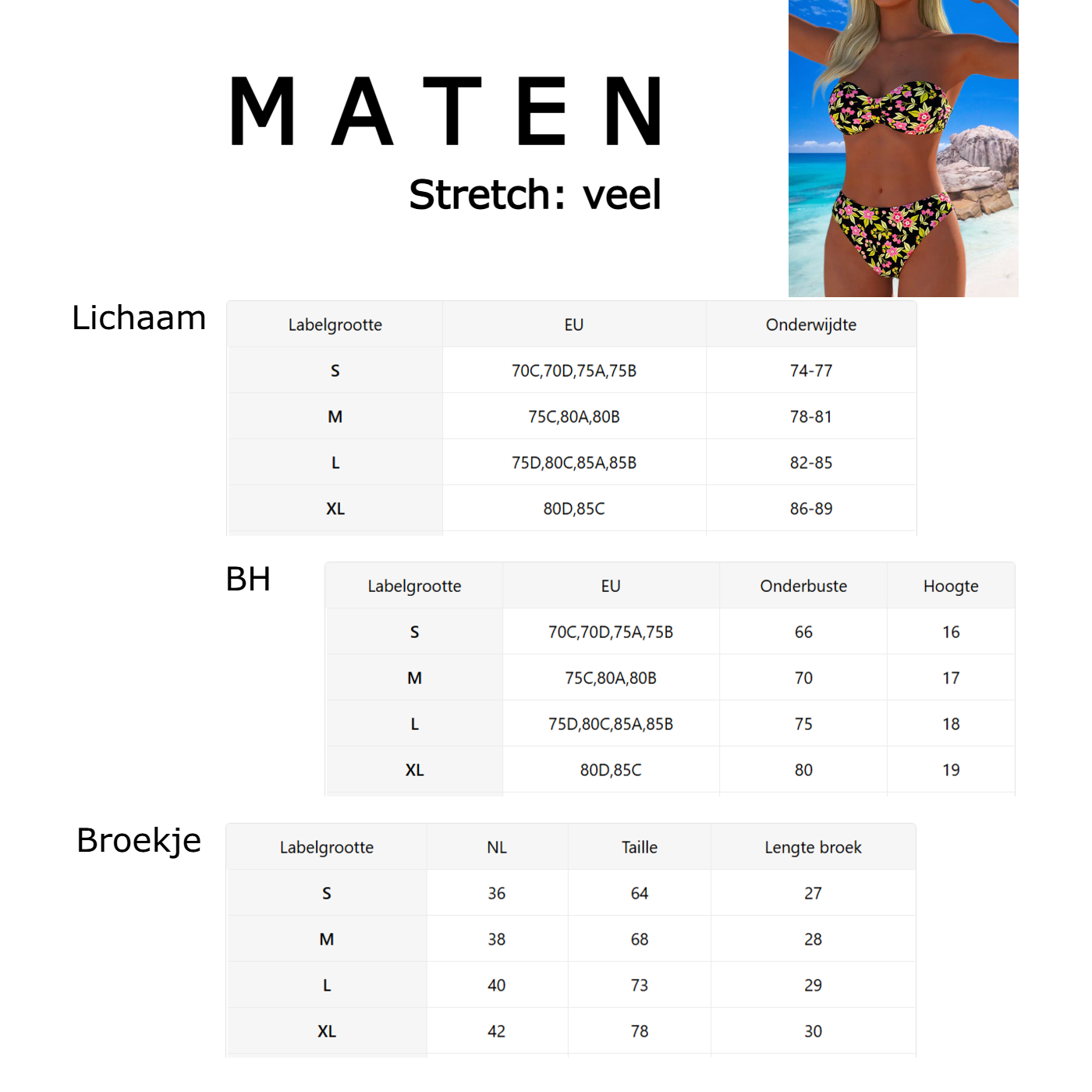 De set bestaat uit een strapless tube-top en een bijpassend bikini broekje met bloemenprint, gemaakt van hoogwaardig materiaal. Dankzij de mix van 82% polyester en 18% elastaan biedt deze bikini een perfecte pasvorm, hoog draagcomfort en blijft hij mooi in vorm – zelfs na meerdere strand- en zwembadbezoeken.