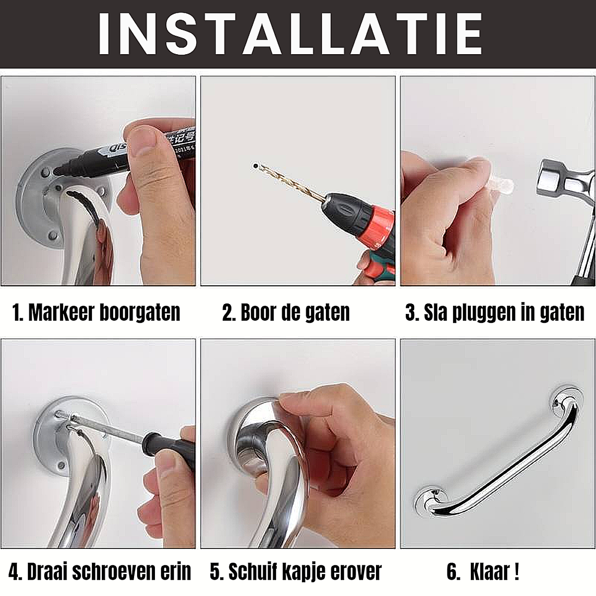 Dankzij het praktische ontwerp kunnen deze handgrepen in slechts enkele minuten worden geïnstalleerd. Alle benodigde bevestigingsmaterialen zijn inbegrepen, waardoor het proces moeiteloos verloopt. Deze wandbeugels kunnen ook parallel, verticaal of schuin worden gemonteerd. Deze handgrepen worden op 6 punten aan de wand/muur bevestigd.