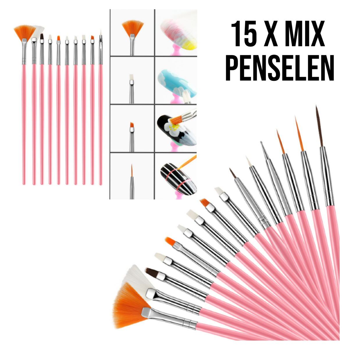 - Aantal penselen: 15 stuks (diverse formaten en types)