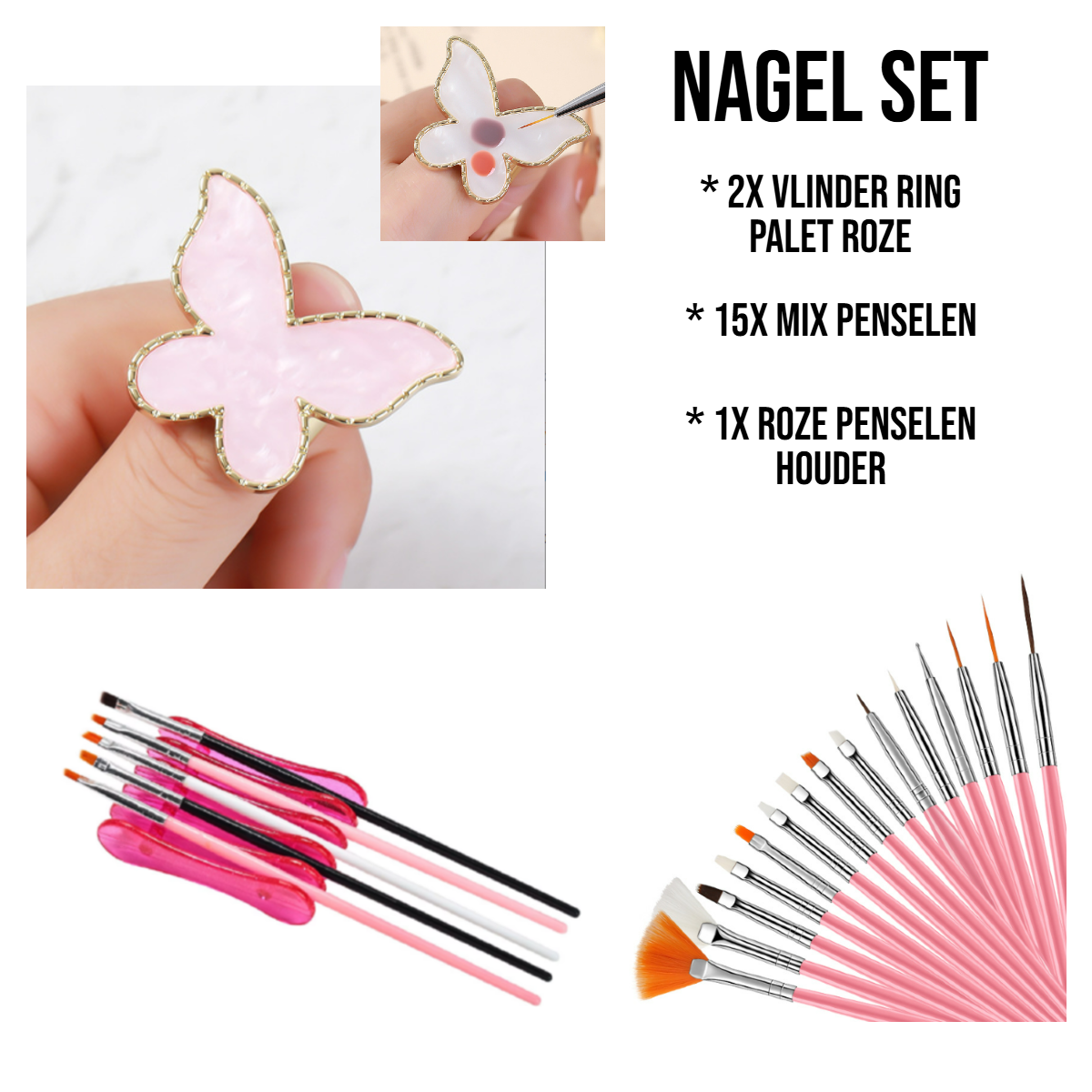 2 Stuks Palet Vlinder Ring Roze + 15 Mix Penselen & Penseelhouder – Compleet Nailartset