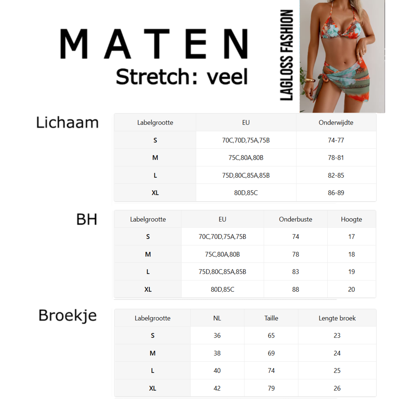 Deze bikini dames set bestaat uit een bikini top, een bijpassend broekje en een stijlvolle wikkelrok. De toevoeging van de rok maakt deze 3 delige bikini dames extra praktisch en uniek. U kunt de rok eenvoudig omdoen wanneer u even niet wilt zwemmen, bijvoorbeeld tijdens een wandeling over het strand of een bezoek aan een strandtent.