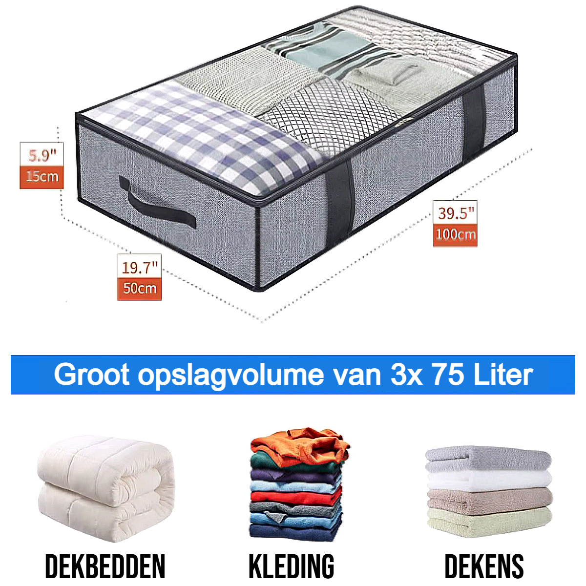Elke tas biedt maar liefst 75 liter aan opbergruimte met royale afmetingen van 100 x 50 x 15 cm, perfect voor grote items zoals dekens, kussens en beddengoed.