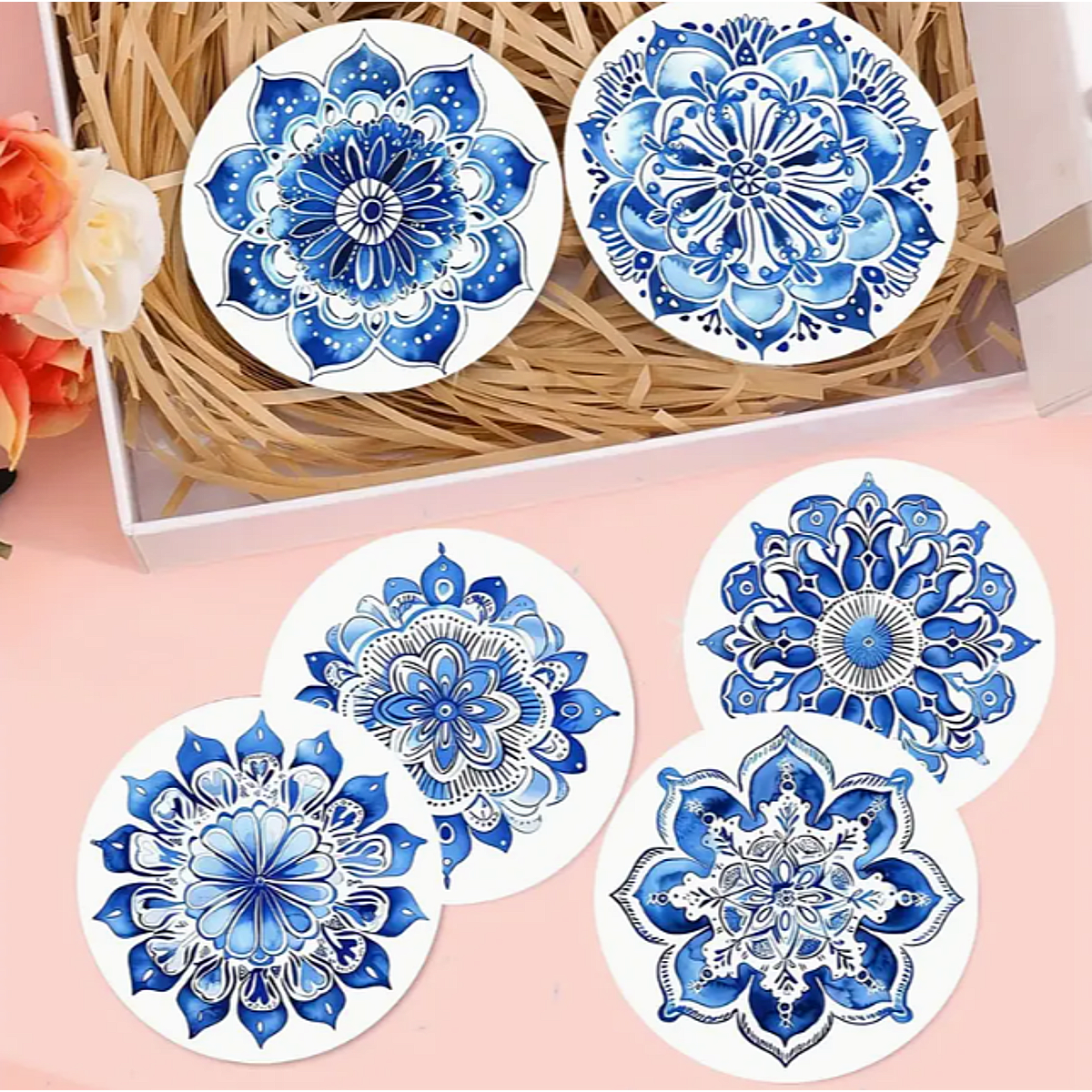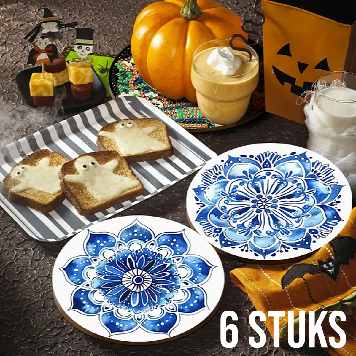 6 Stuks Houten Mandala Onderzetters Blauw-Wit - Hittebestendig Decoratief Blauw