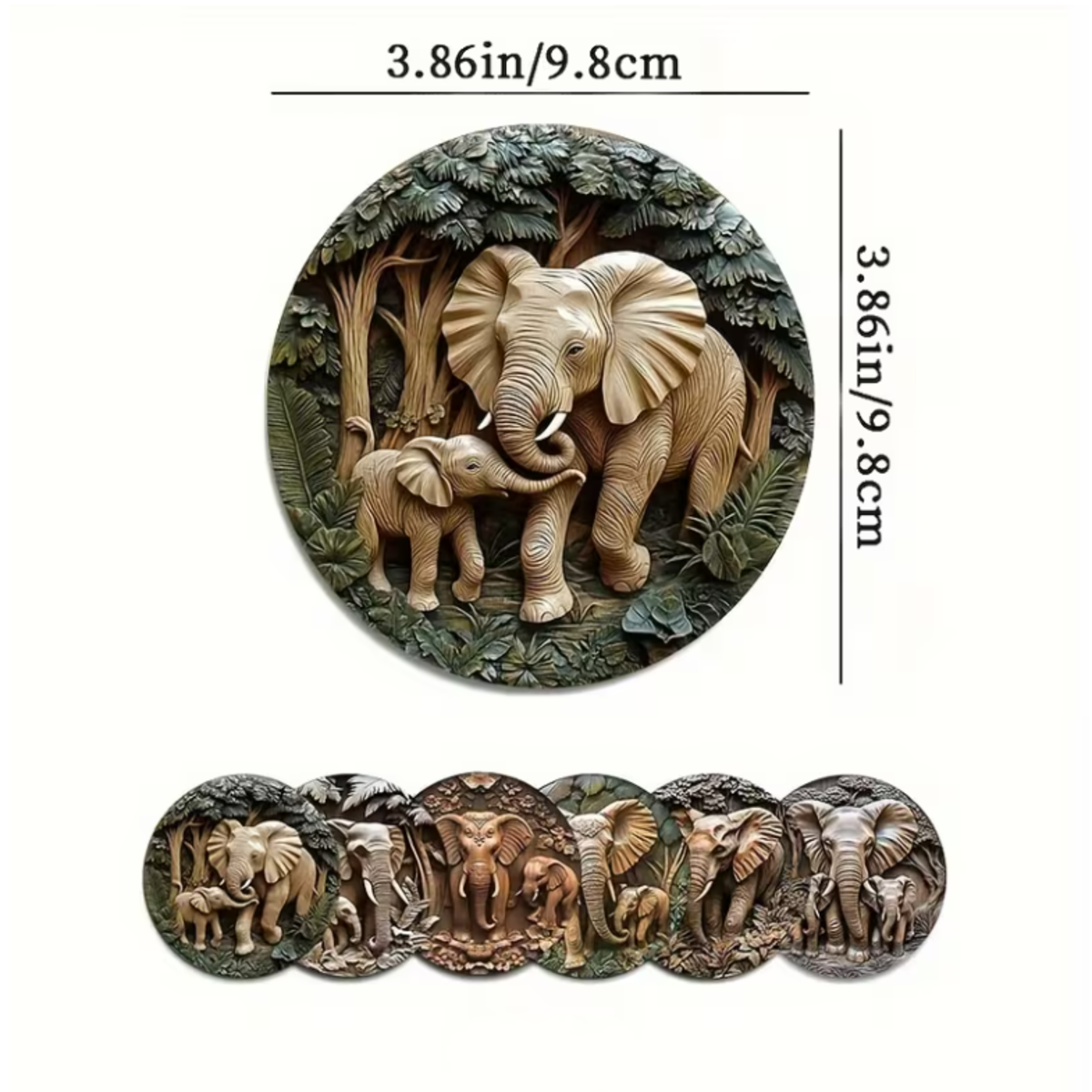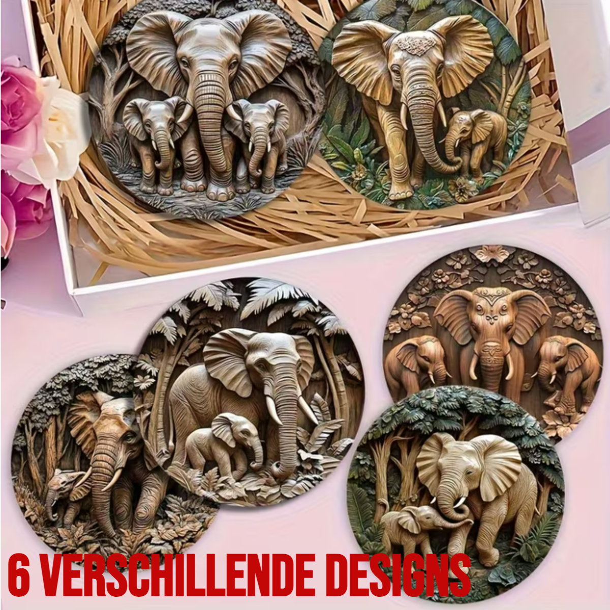 Breng sfeer en karakter op tafel met deze stijlvolle set houten onderzetters met olifantenprint. Elke onderzetter toont een andere olifant in een warm, decoratief ontwerp. De combinatie van natuur, dieren en hout maakt deze set een rustige maar opvallende toevoeging aan uw interieur.