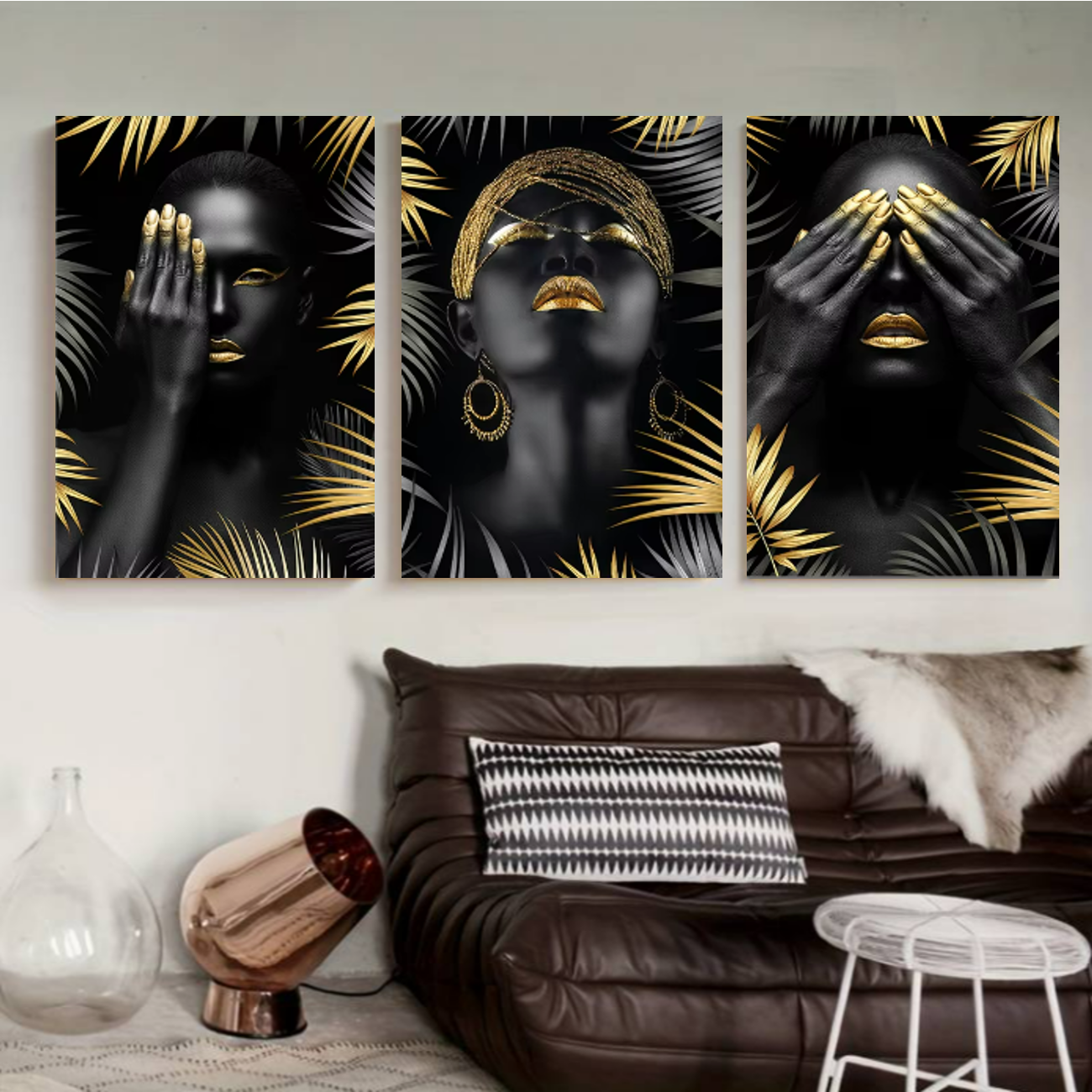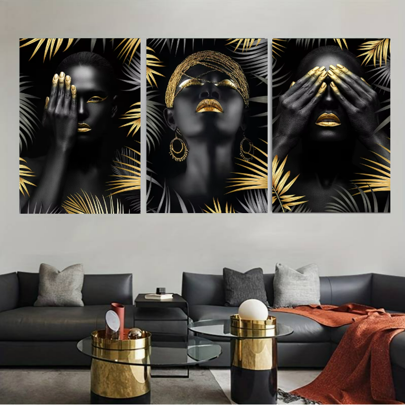Allernieuwste.nl® Canvas Schilderij 3-Luik Vrouw Zwart Goud - Horen Zien Zwijgen - Modern Poster - 3x 50x70cm