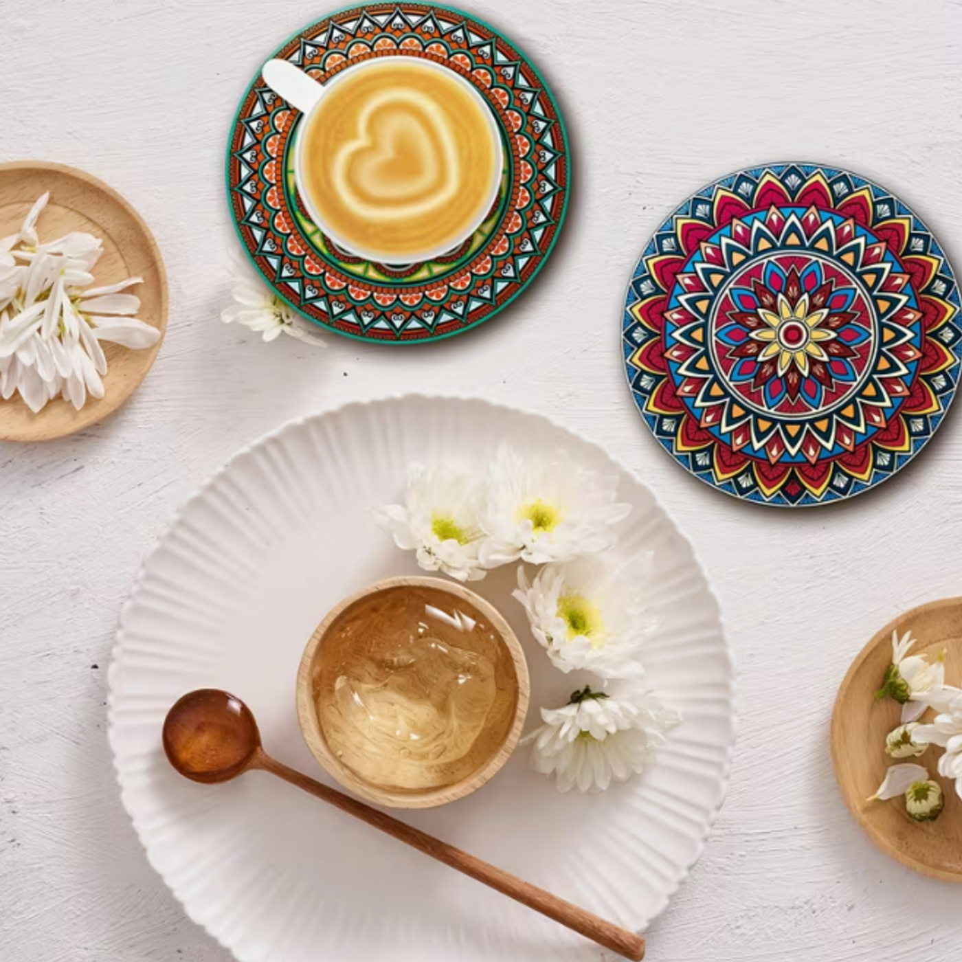 De gedetailleerde mandala-print geeft elke ruimte een warme, rustgevende uitstraling. Of u nu een modern, bohemian of klassiek interieur heeft, deze mandala onderzetters passen moeiteloos in elke woonstijl. Ze beschermen uw tafel tegen kringen, vocht en hitte en zijn daardoor perfect als tafelbescherming in huis, op kantoor of in een horecagelegenheid.