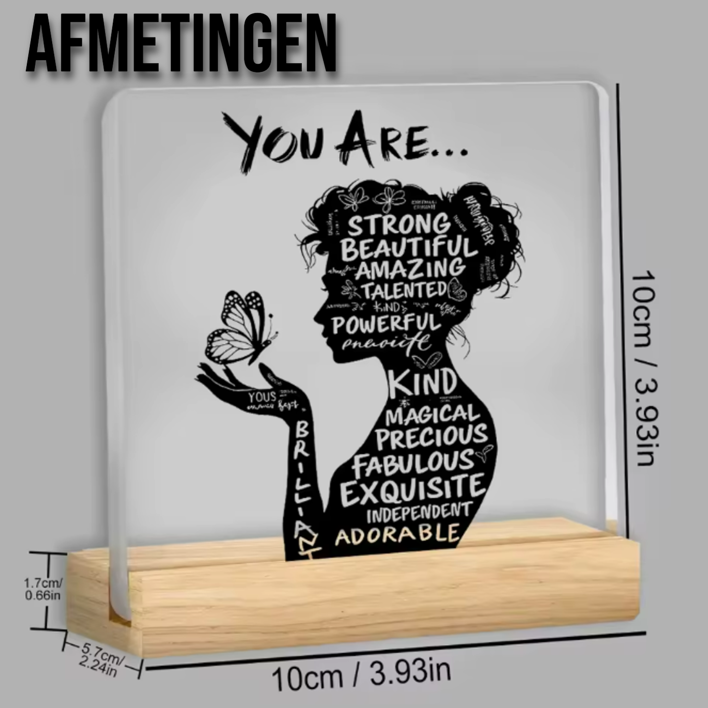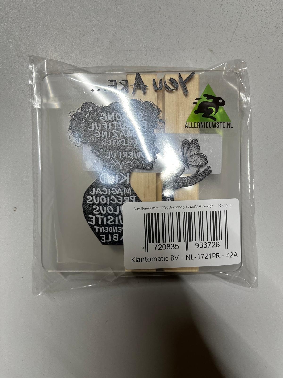 Allernieuwste.nl® Inspirerend Acryl Bureau Bord – “You Are Strong, Beautiful & Enough” Decoratie met Houten Standaard – 10 x 10 cm