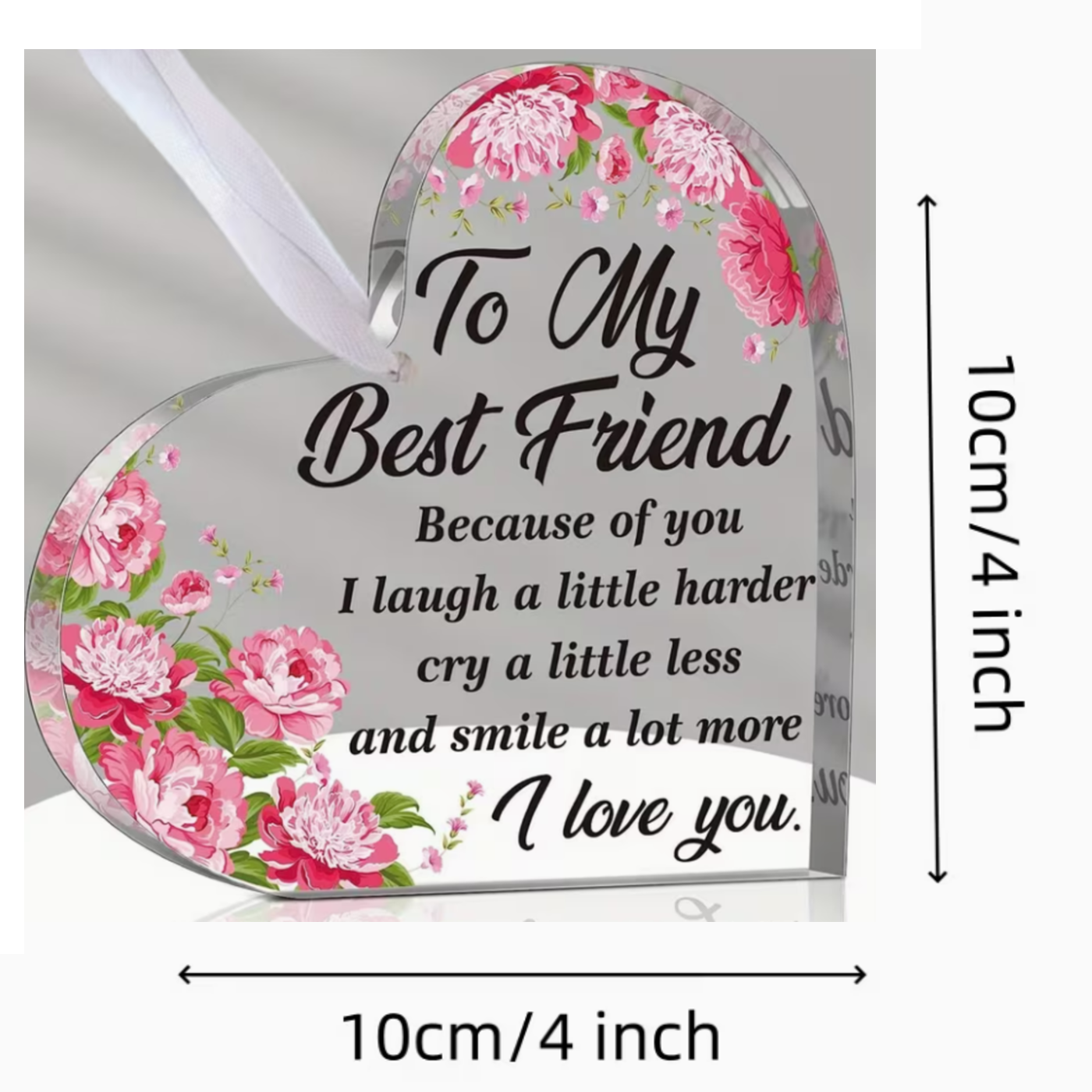 Het decoratieve hart is gemaakt van stevig acryl en heeft een formaat van 10 x 10 cm. De transparante uitstraling zorgt voor een moderne en stijlvolle look. Hierdoor komt de boodschap of het design extra mooi naar voren. Door het meegeleverde touwtje kan deze hartvormige hangdecoratie gemakkelijk worden bevestigd aan een raam, deurklink, wandhaak of zelfs aan de binnenspiegel van een auto.