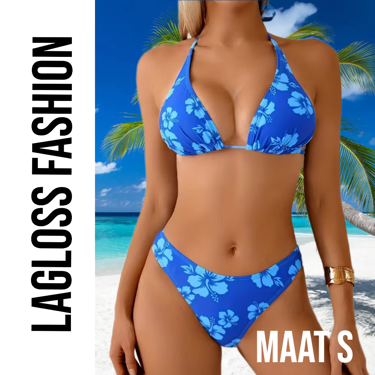 LaGloss® Blauwe Bloemenprint Bikini Dames – Halter Top – 2-delig Badmode - Modieuze Zwemkleding Strandoutfit – Maat S