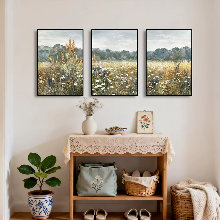 Dit boho wanddecoratie canvas is geïnspireerd op de schoonheid van de natuur en geeft uw ruimte een lichte en ontspannen sfeer. De subtiele kleuren en schilderachtige stijl maken het een ideale bloemen schilderij set voor woonkamers, slaapkamers, gangen of werkruimtes. Door het drieluik ontwerp ontstaat een dynamisch en ruimtelijk effect op de muur, waardoor de decoratie direct een blikvanger wordt.