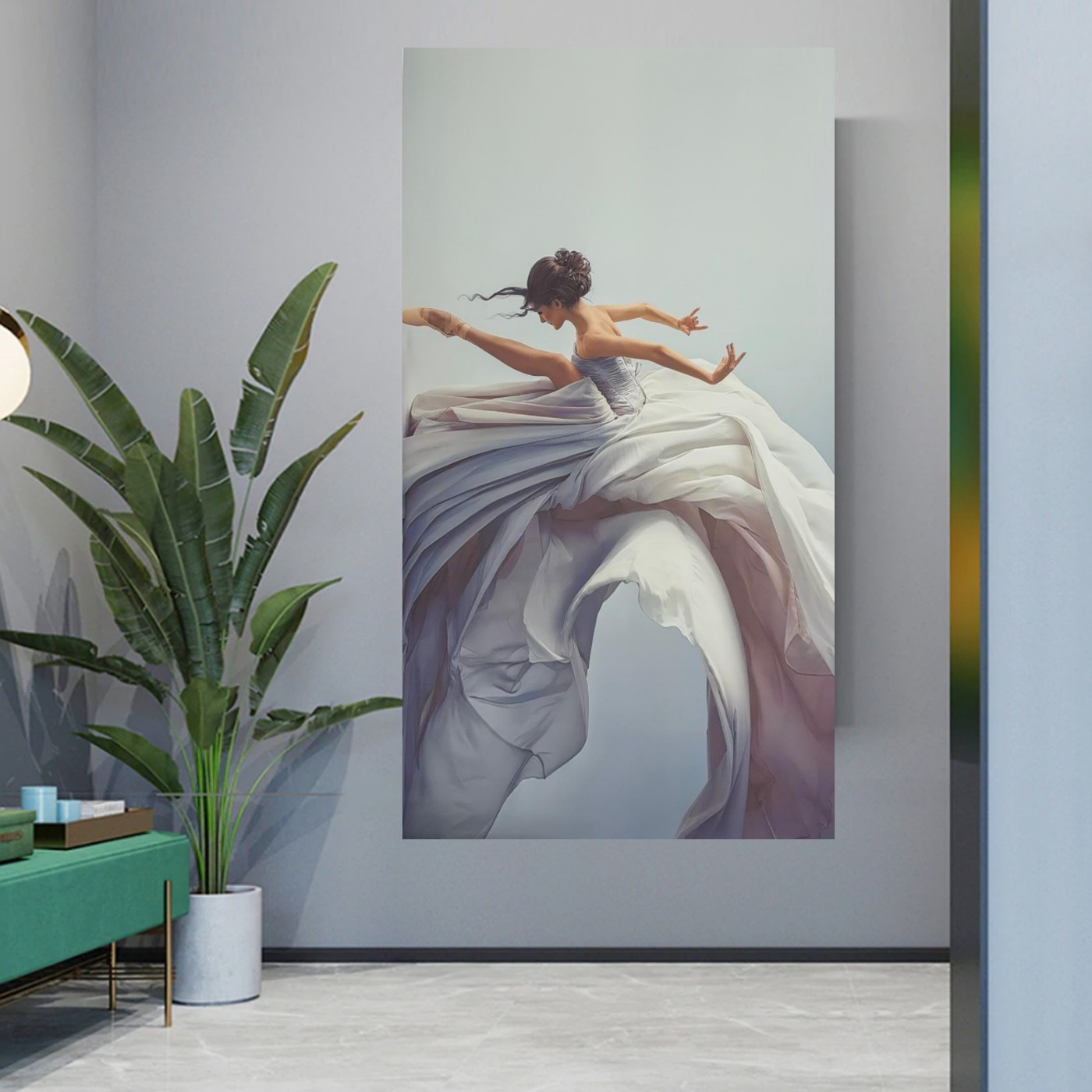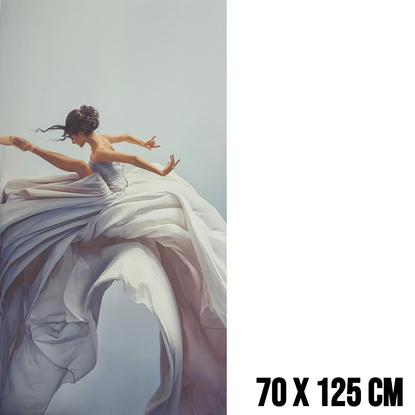 Breng elegantie, beweging en artistieke schoonheid in uw interieur met dit indrukwekkende ballerina canvas schilderij. Op dit prachtige kunstwerk ziet u een ballerina die hoog in de lucht springt tijdens een sierlijke dansbeweging. Eén been is elegant omhoog gestrekt terwijl haar grote, zwierende jurk door de lucht beweegt. De dynamische houding en de vloeiende beweging van de jurk geven het schilderij een gevoel van vrijheid, kracht en gratie.