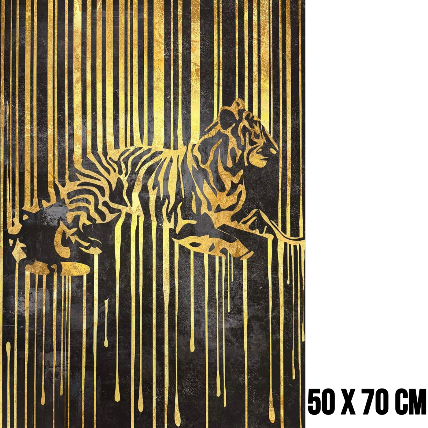 Met een formaat van 50 x 70 cm heeft dit canvas muurdecoratie een ideaal formaat dat goed tot zijn recht komt op verschillende plekken in huis. Hang het schilderij bijvoorbeeld boven een dressoir, bank of bed voor een stijlvolle en opvallende decoratie. Door de sterke kleurcontrasten vormt deze zwarte en gouden wanddecoratie een opvallend kunstwerk dat luxe en elegantie uitstraalt.