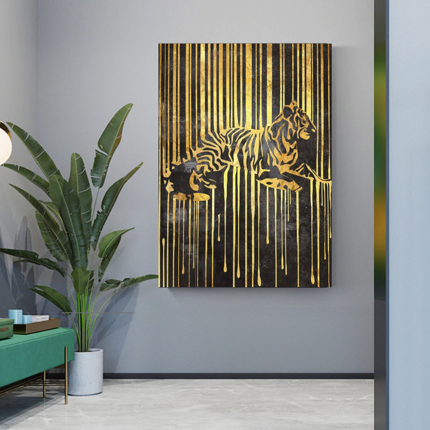 Geef uw interieur een krachtige en luxe uitstraling met dit indrukwekkende tijger canvas schilderij. Op dit bijzondere kunstwerk ligt een majestueuze tijger afgebeeld in prachtige goud- en zwarttinten. De achtergrond bestaat eveneens uit goud en zwart, waarbij het goud lijkt te smelten of langzaam naar beneden te druipen. Dit unieke effect geeft het schilderij een moderne, artistieke en luxe uitstraling die direct de aandacht trekt.