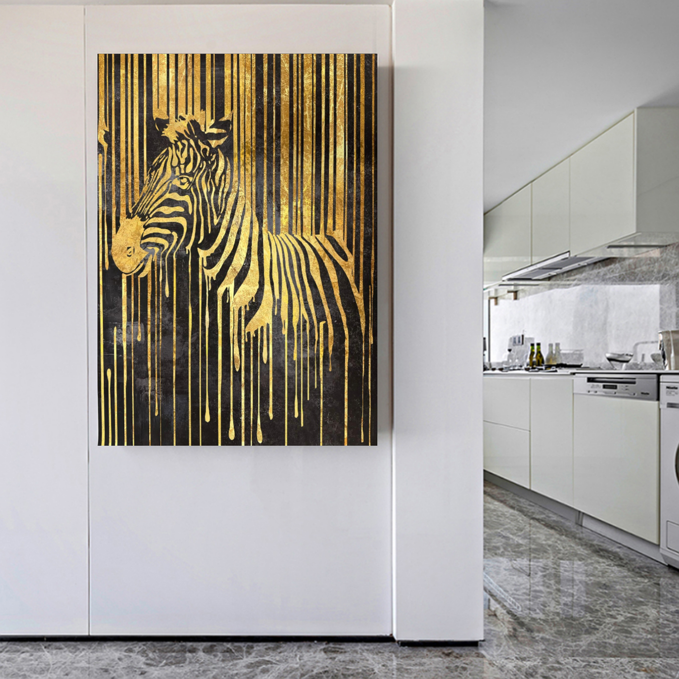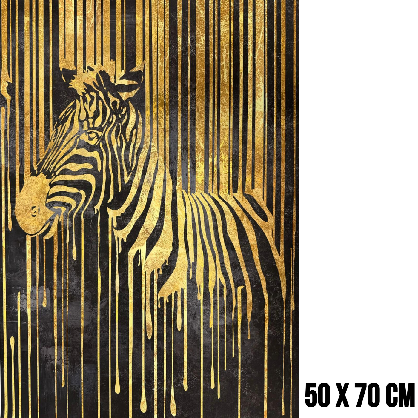 Geef uw interieur een krachtige en luxe uitstraling met dit indrukwekkende zebra canvas schilderij. Op dit bijzondere kunstwerk wordt een majestueuze zebra afgebeeld in prachtige goud- en zwarttinten. De achtergrond bestaat eveneens uit goud en zwart, waarbij het goud lijkt te smelten of langzaam naar beneden te druipen. Dit unieke effect geeft het schilderij een moderne, artistieke en luxe uitstraling die direct de aandacht trekt.