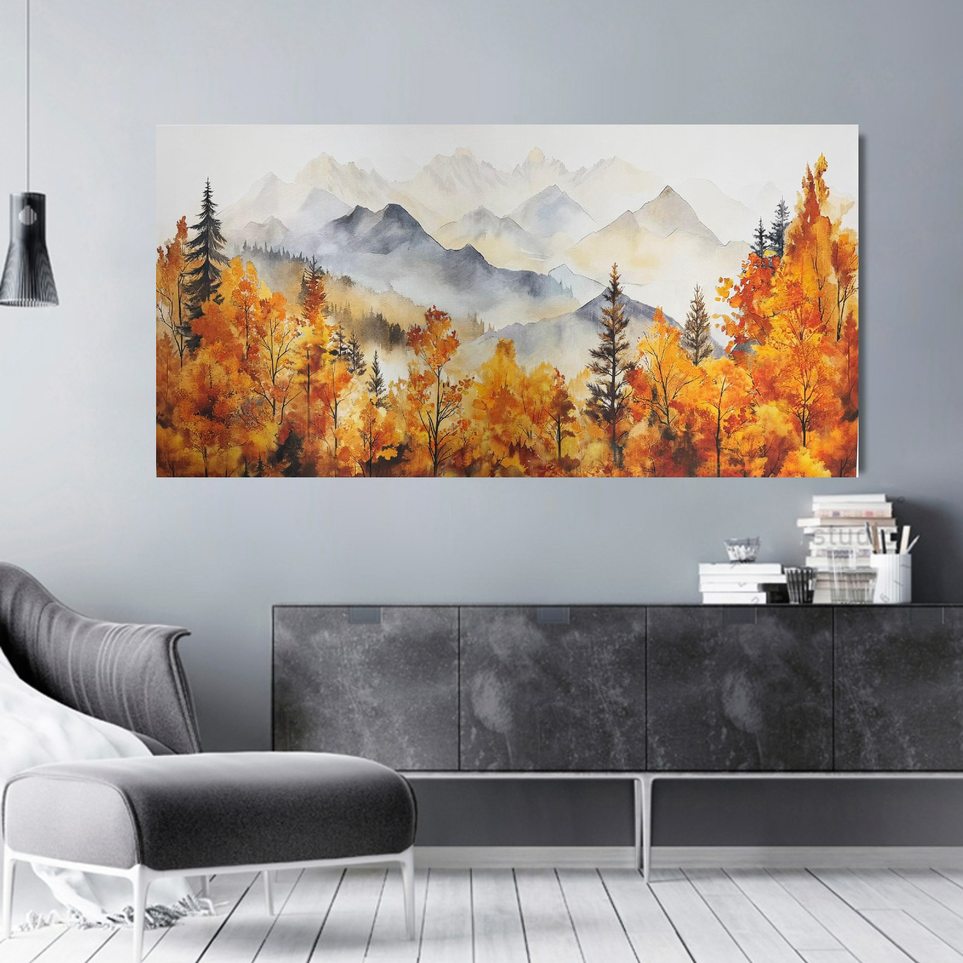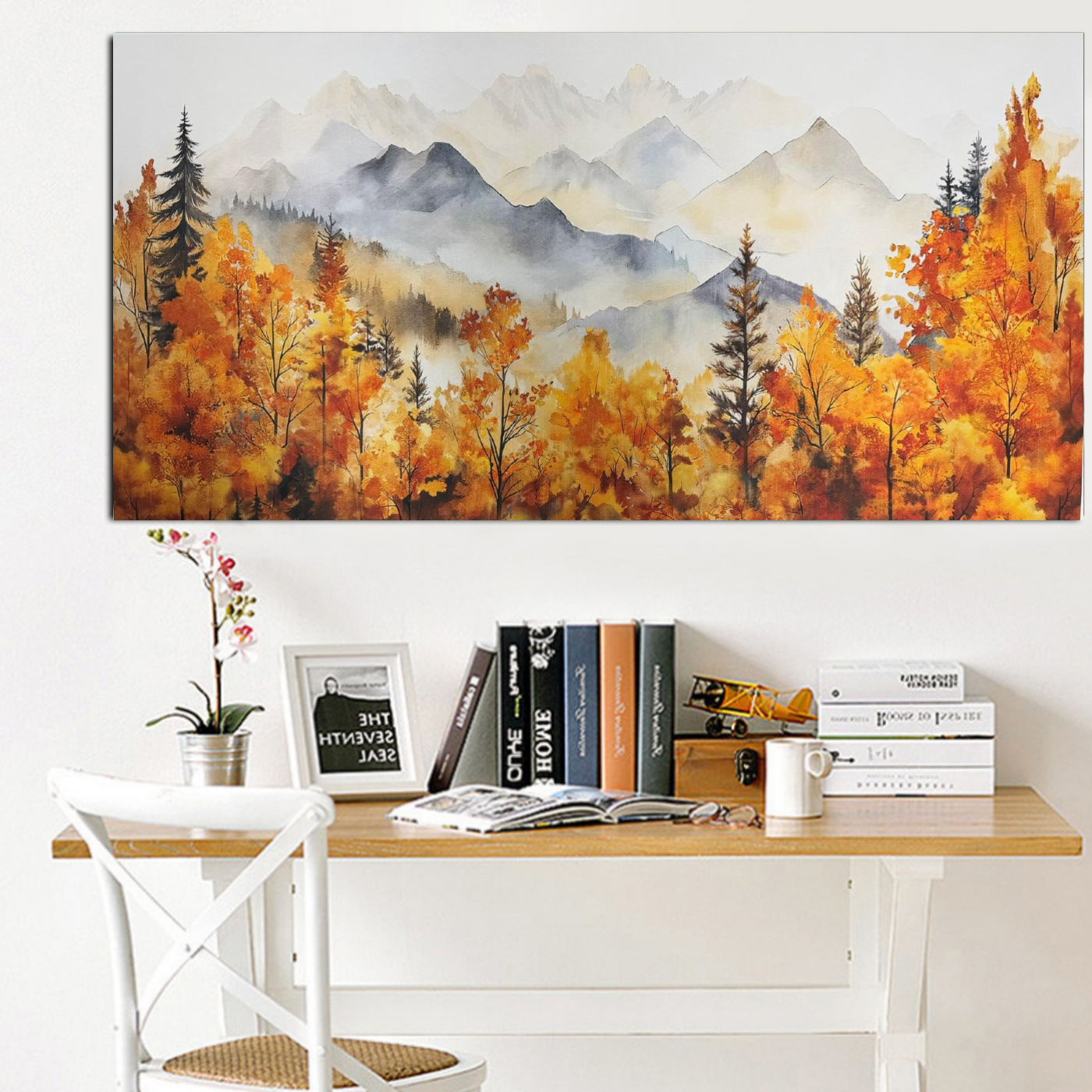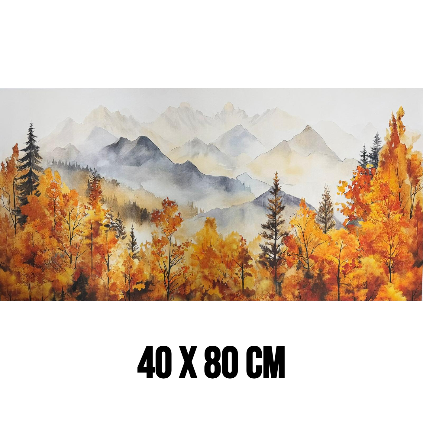 Breng rust, natuur en warme herfsttinten in uw interieur met dit prachtige herfstlandschap canvas schilderij. Dit kunstwerk toont een sfeervolle aquarelillustratie van een boslandschap met bomen in warme herfstkleuren en mistige bergen op de achtergrond. De combinatie van zachte kleuren en natuurlijke vormen zorgt voor een kalme en harmonieuze uitstraling.