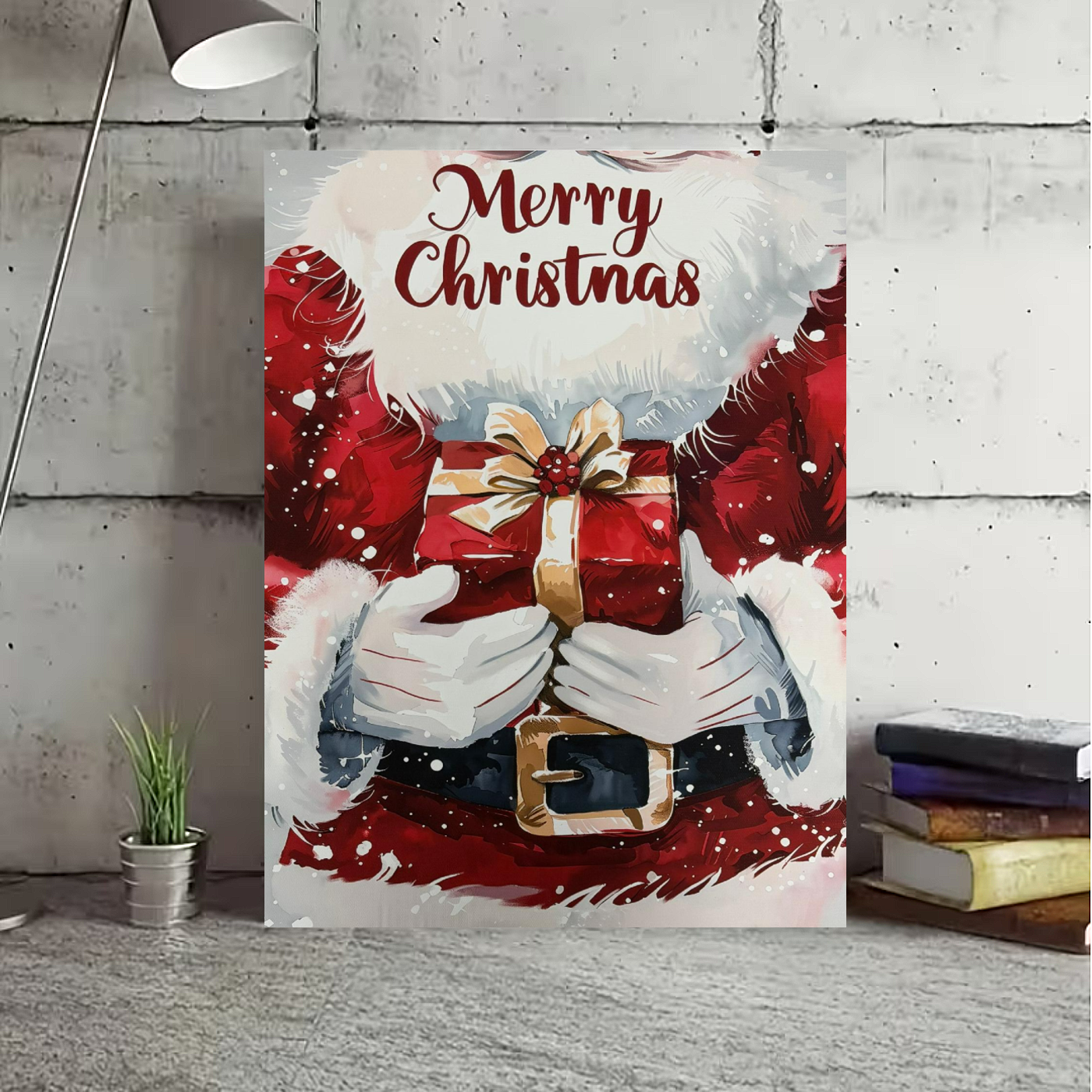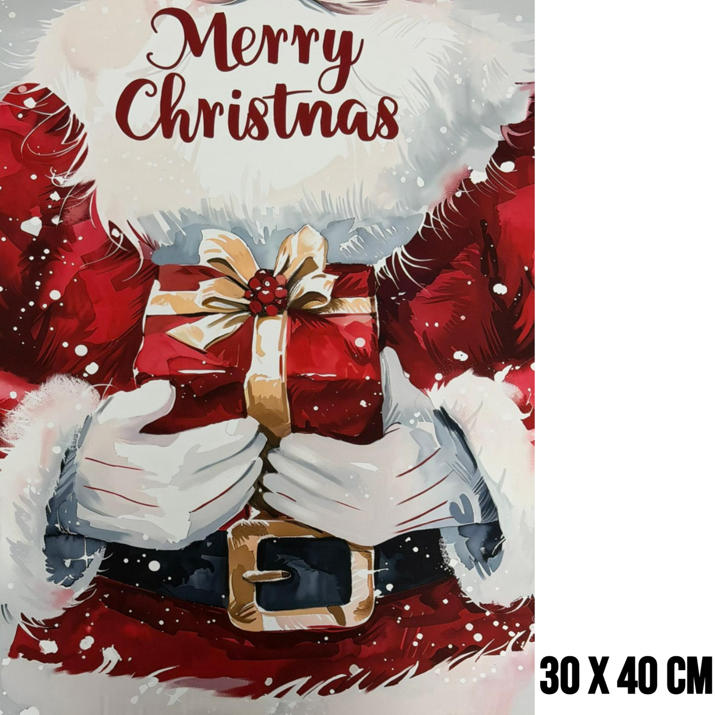 Breng de magie van de feestdagen in huis met dit Kerstman canvas schilderij van 30 x 40 cm. Het kunstwerk toont een vrolijke kerstman die een mooi ingepakt cadeau vasthoudt, met daarboven de feestelijke tekst "Merry Christmas". Dit canvas is een perfecte toevoeging aan uw interieur tijdens de kerstperiode en zorgt voor een warme en gezellige sfeer in elke ruimte.