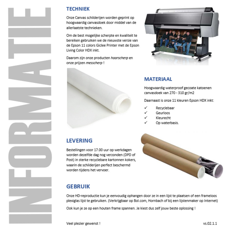 De afbeeldingen wordt geprint op hoogwaardig canvasdoek door middel van de allerlaatste technieken.
