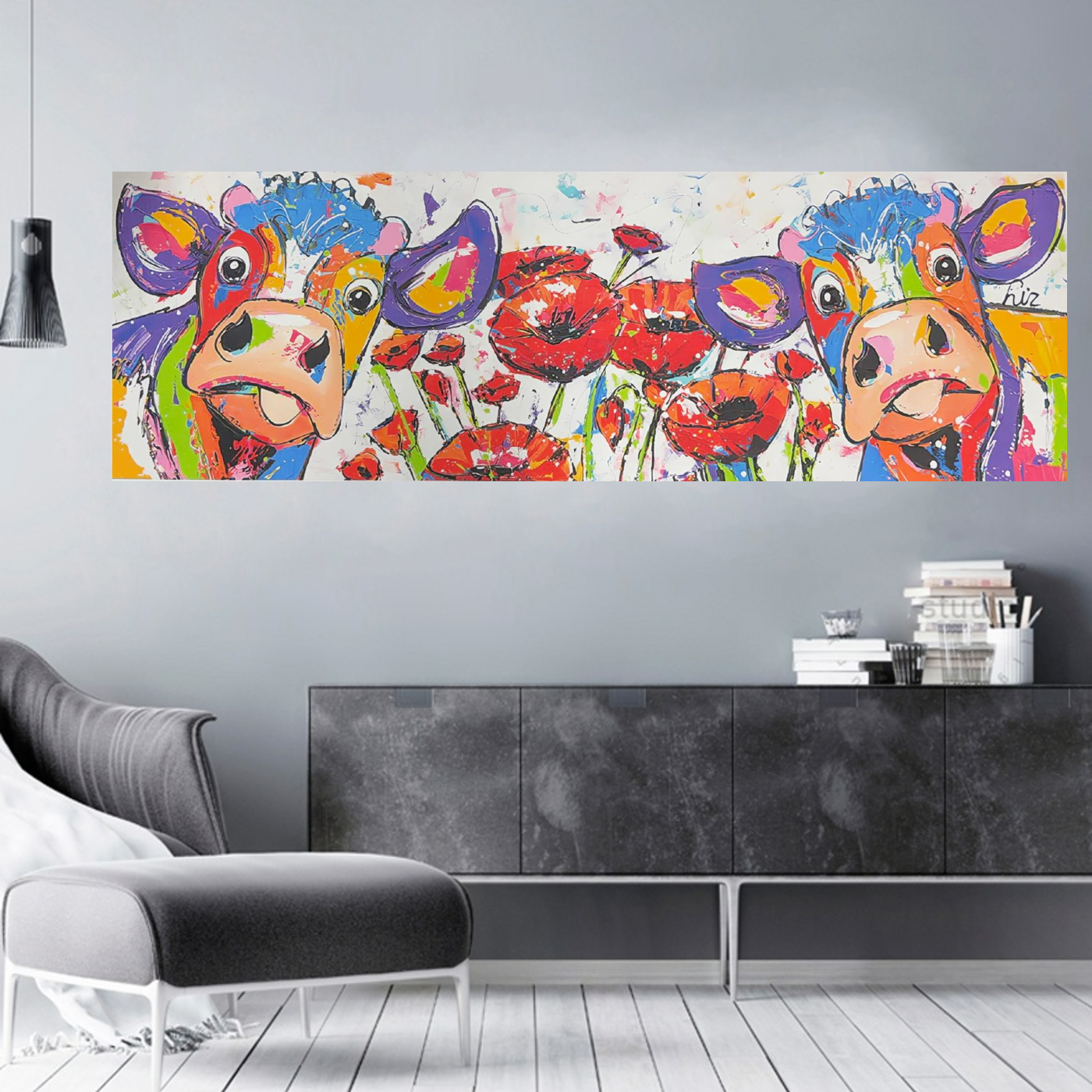 Allernieuwste.nl® Canvas Schilderij Kleurrijke Abstracte Koeien met Bloemen – 40 x 120 cm – Moderne Wanddecoratie – Abstracte kunst – Muurdecoratie