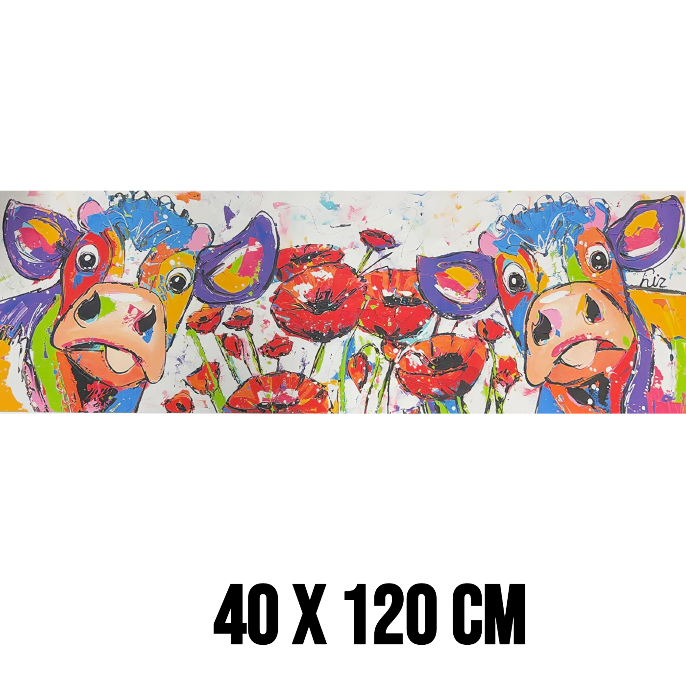 Breng kleur en karakter in uw interieur met dit unieke canvas schilderij van een kleurrijke abstracte koe omringd door bloemen. De levendige kleuren en artistieke stijl maken dit kunstwerk een echte blikvanger in elke ruimte. Perfect voor liefhebbers van dierenkunst en moderne, speelse wanddecoratie.