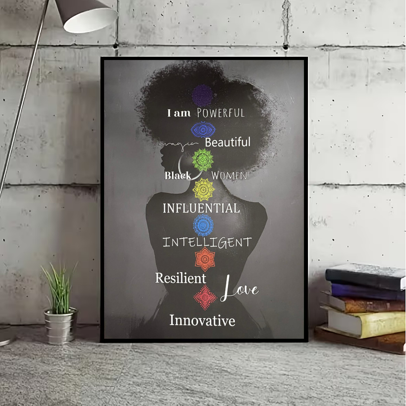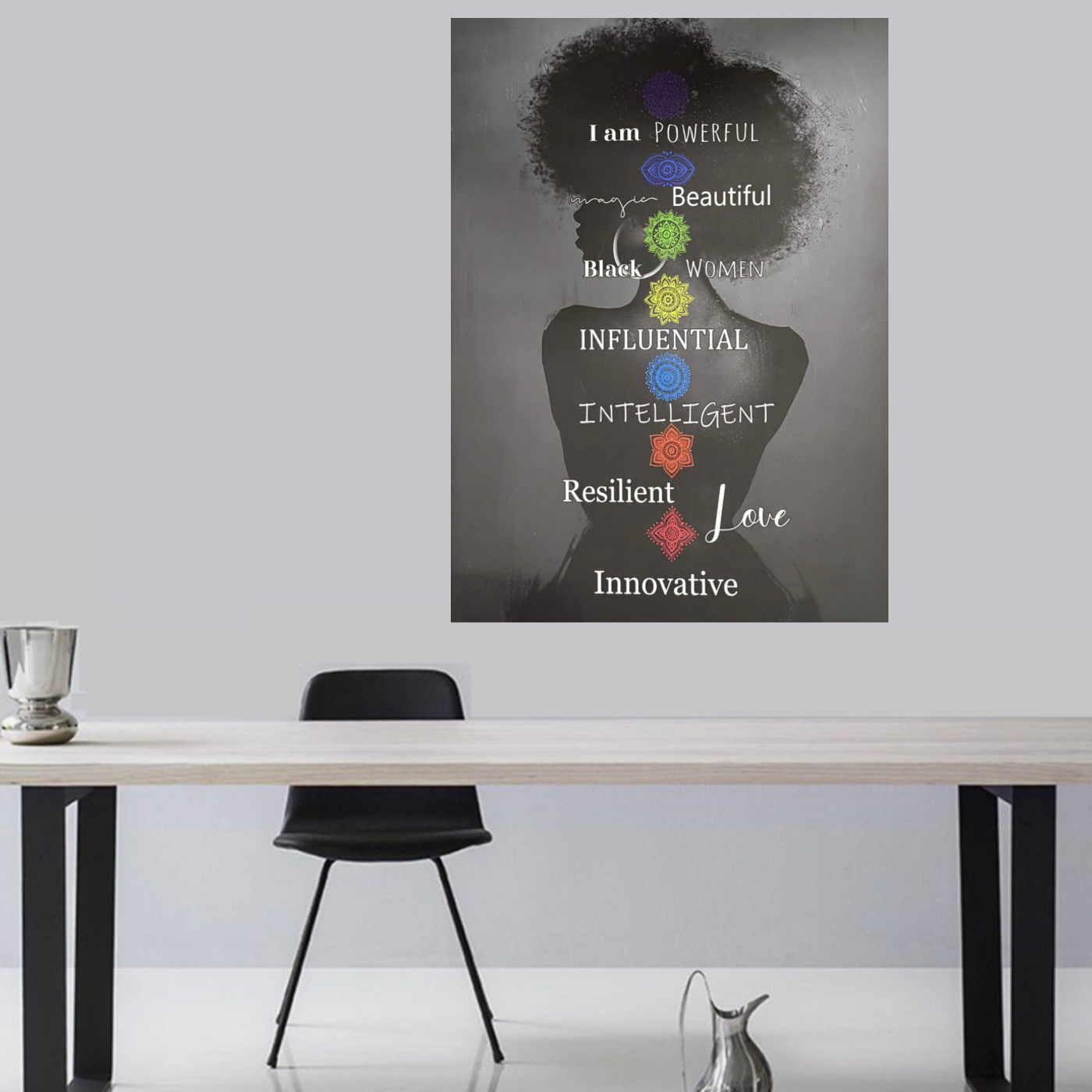 Allernieuwste.nl® Canvas Schilderij Krachtige Vrouw Chakra’s – 50 x 70 cm - Spirituele Wanddecoratie Zwart – Muurdecoratie - Inspirerende Affirmaties voor Zelfwaarde en Persoonlijke Groei