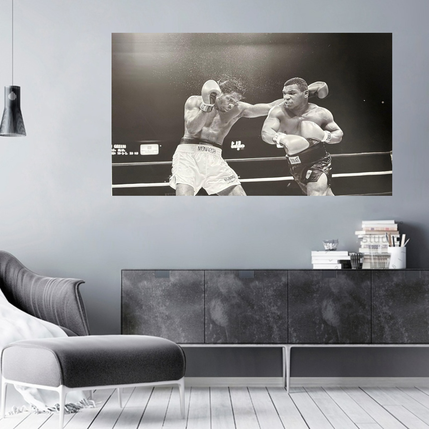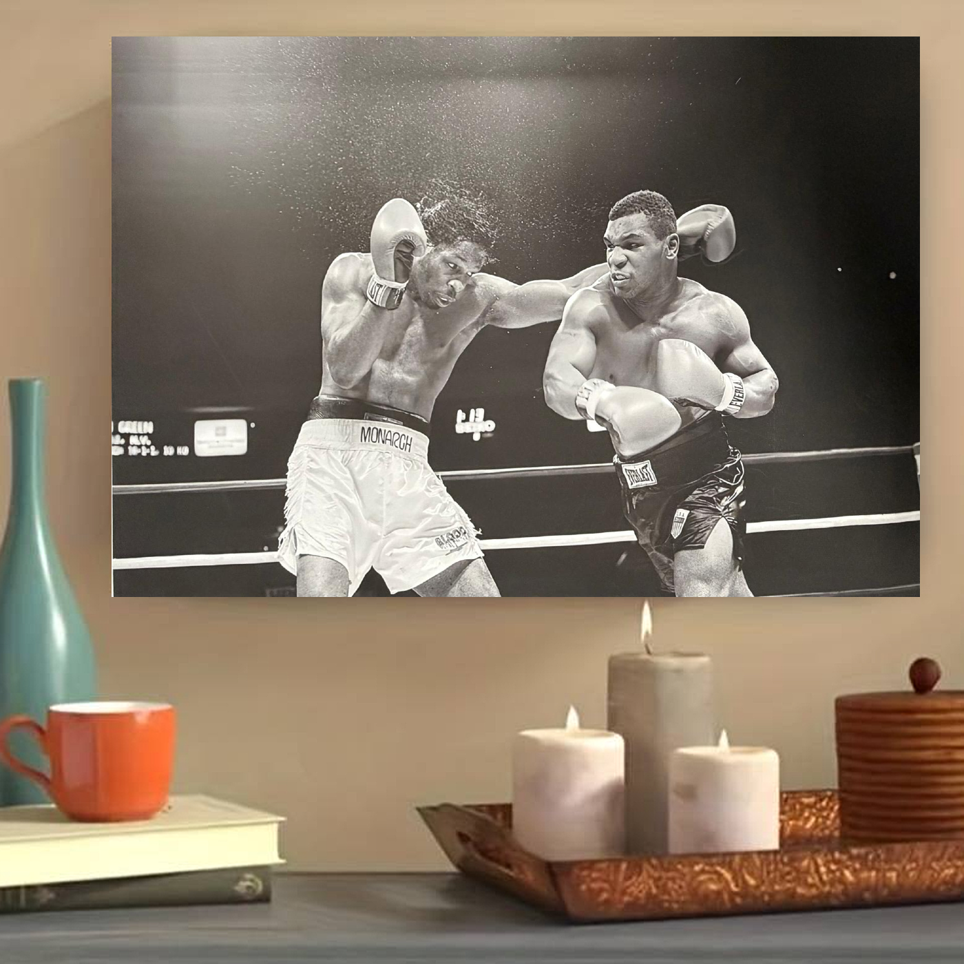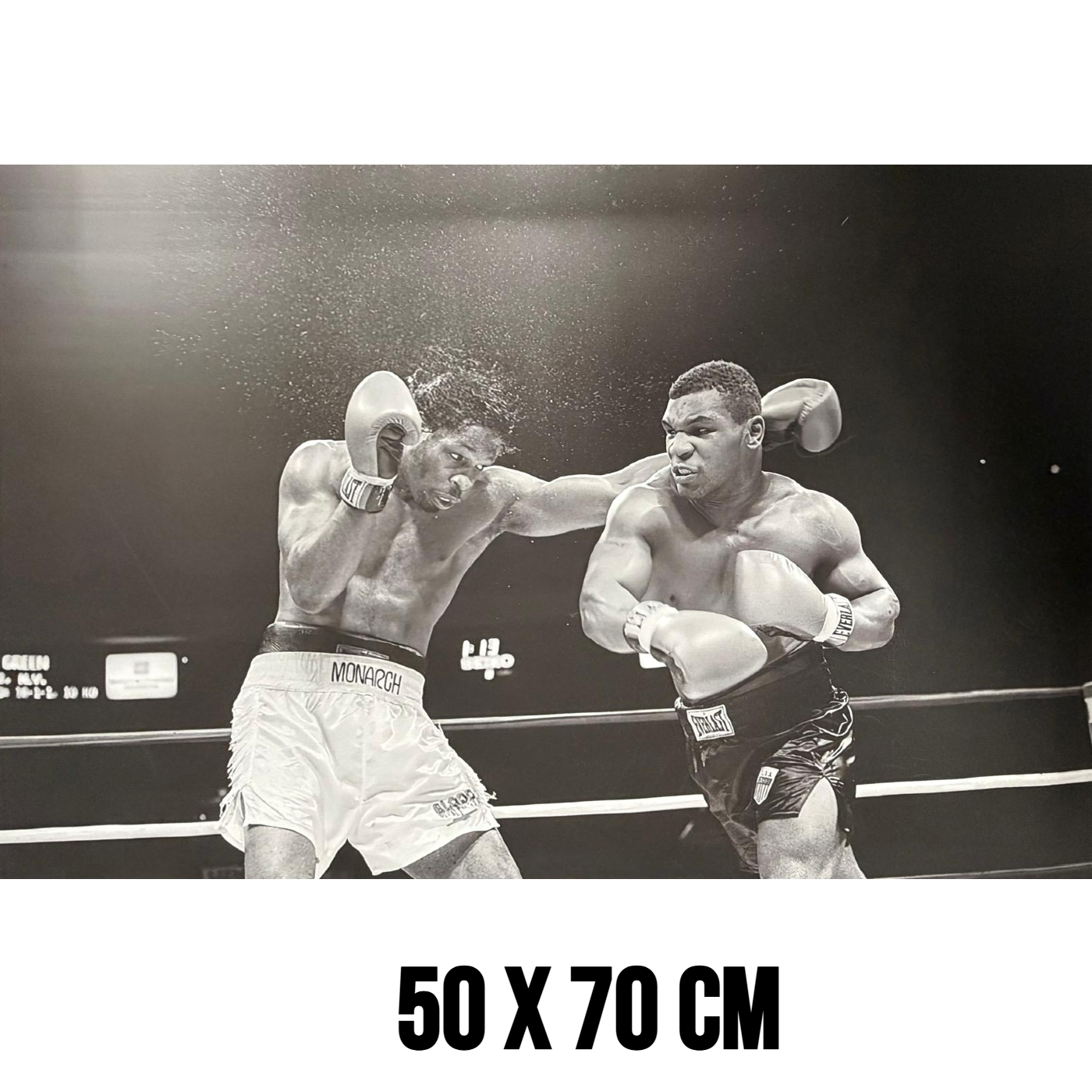 De foto laat zien hoe Tyson een krachtige stoot uitdeelt terwijl beide boksers volledig gefocust zijn in de ring. De zwart-wit stijl versterkt de dramatiek en legt de nadruk op beweging, kracht en emotie. Hierdoor krijgt het kunstwerk een tijdloze en rauwe uitstraling die perfect past bij liefhebbers van sport en klassieke fotografie.