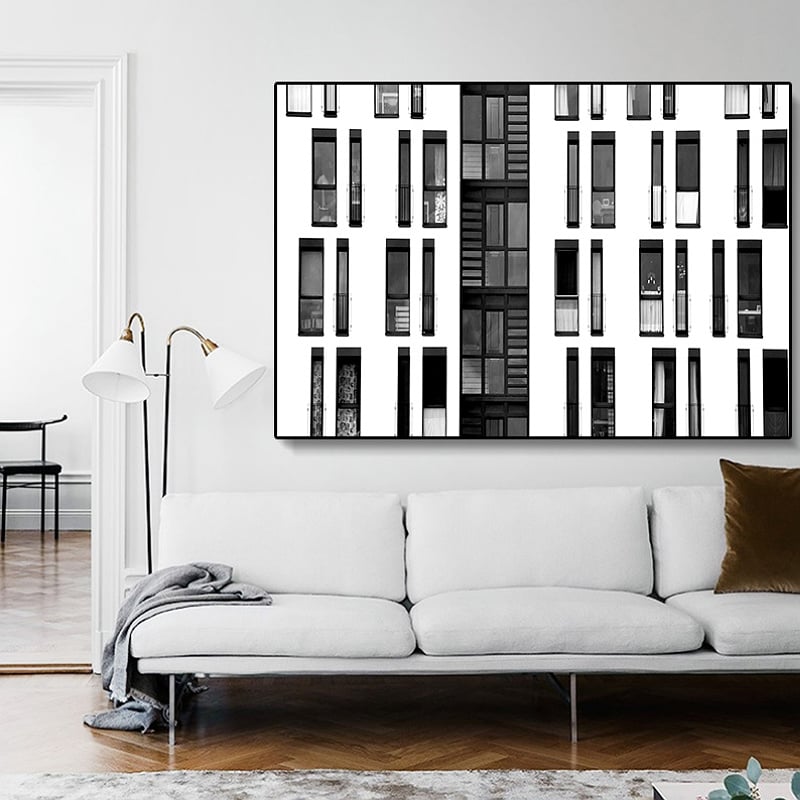 Dit canvas schilderij oogt modern, strak en fris. Geometrisch stadsgebouw in een moderne Industriële