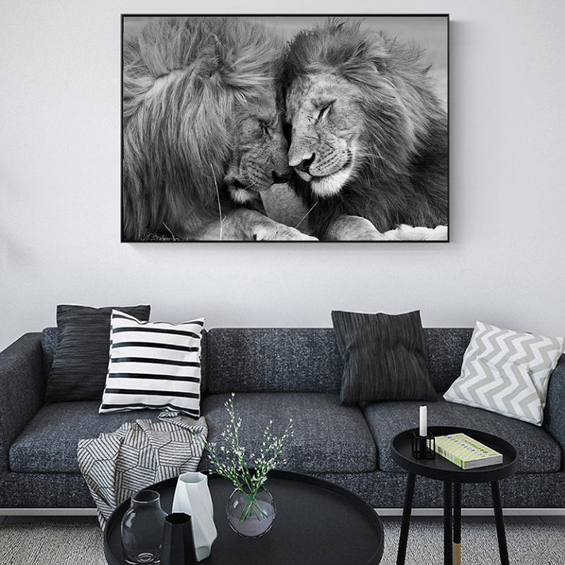 Dit bijzondere schattige kunstwerk van een vredig paar leeuwen is een echte blikvanger en heeft een enorm energieke uitstraling. Deze HD-print oogt modern en fris en is met name geschikt voor uw werkkamer, slaapkamer, kinderkamer of moderne woonkamer. Een muurbekleding in zwart/wit, die in iedereen tedere gevoelens teweeg brengt.