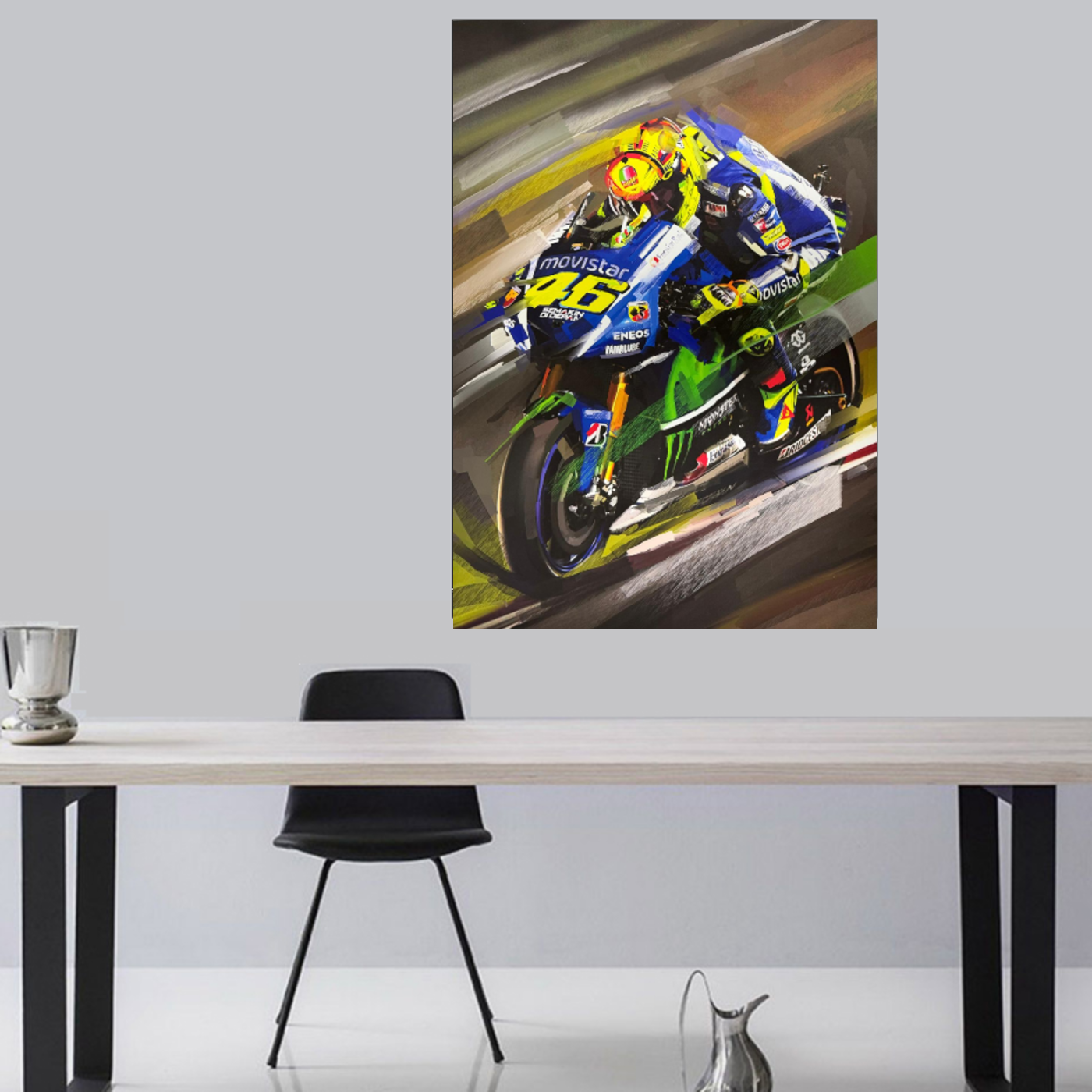 Het schilderij legt het moment van een intense race perfect vast. De motor helt in de bocht terwijl Rossi volledig gefocust is op de wedstrijd. Hierdoor krijgt dit motorsport canvas schilderij een realistische en spannende uitstraling die motorsportliefhebbers direct zullen herkennen.