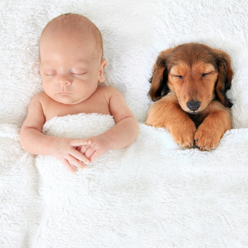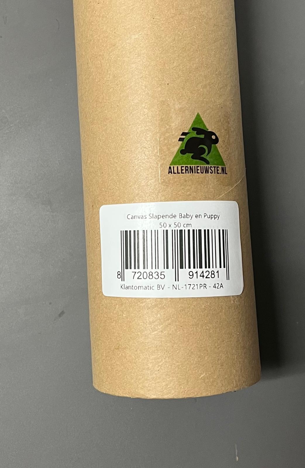 Allernieuwste.nl® Canvas Schilderij Slapende Baby en Puppy - Kunst aan je Muur - Romantisch - kleur - 50 x 50 cm