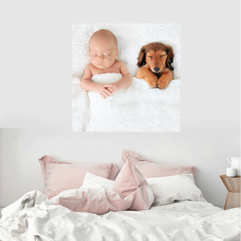 Canvas Schilderij * Slapende Baby en Puppy * - Kunst aan je Muur - Romantisch - kleur - 50 x 50 cm
