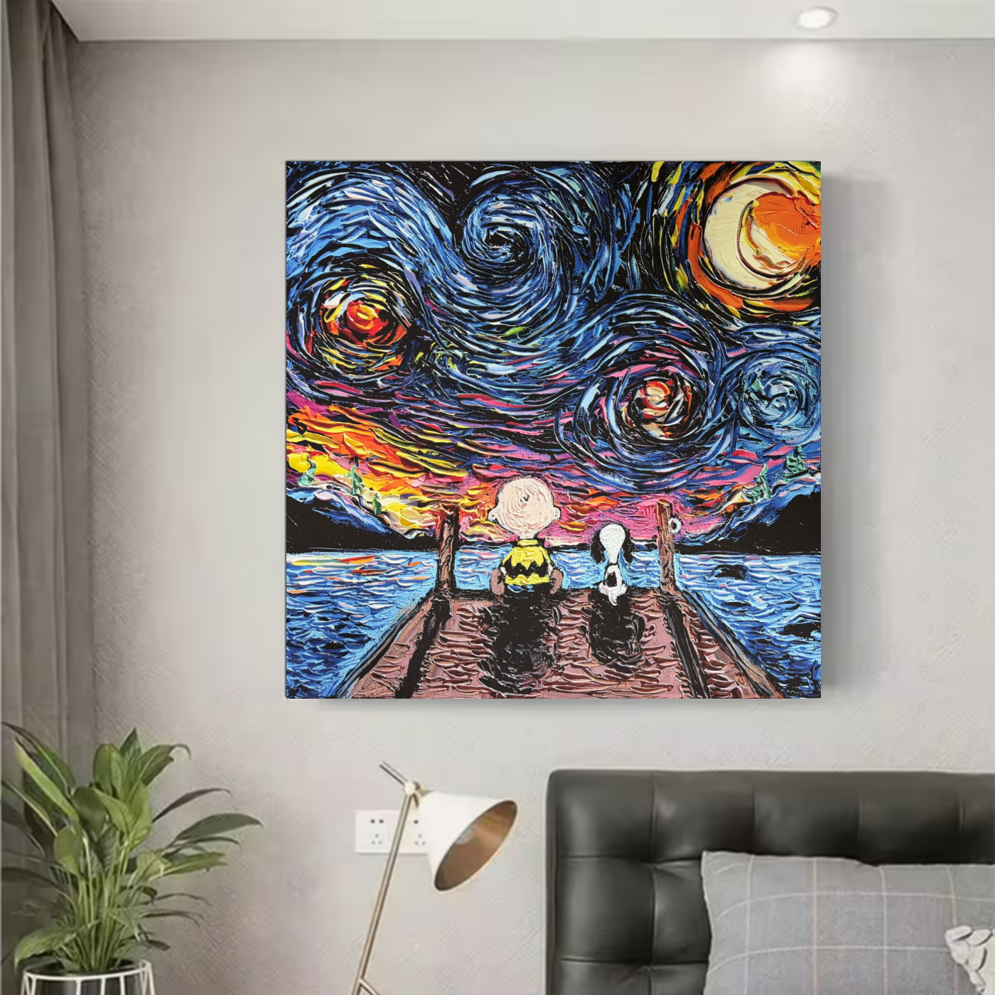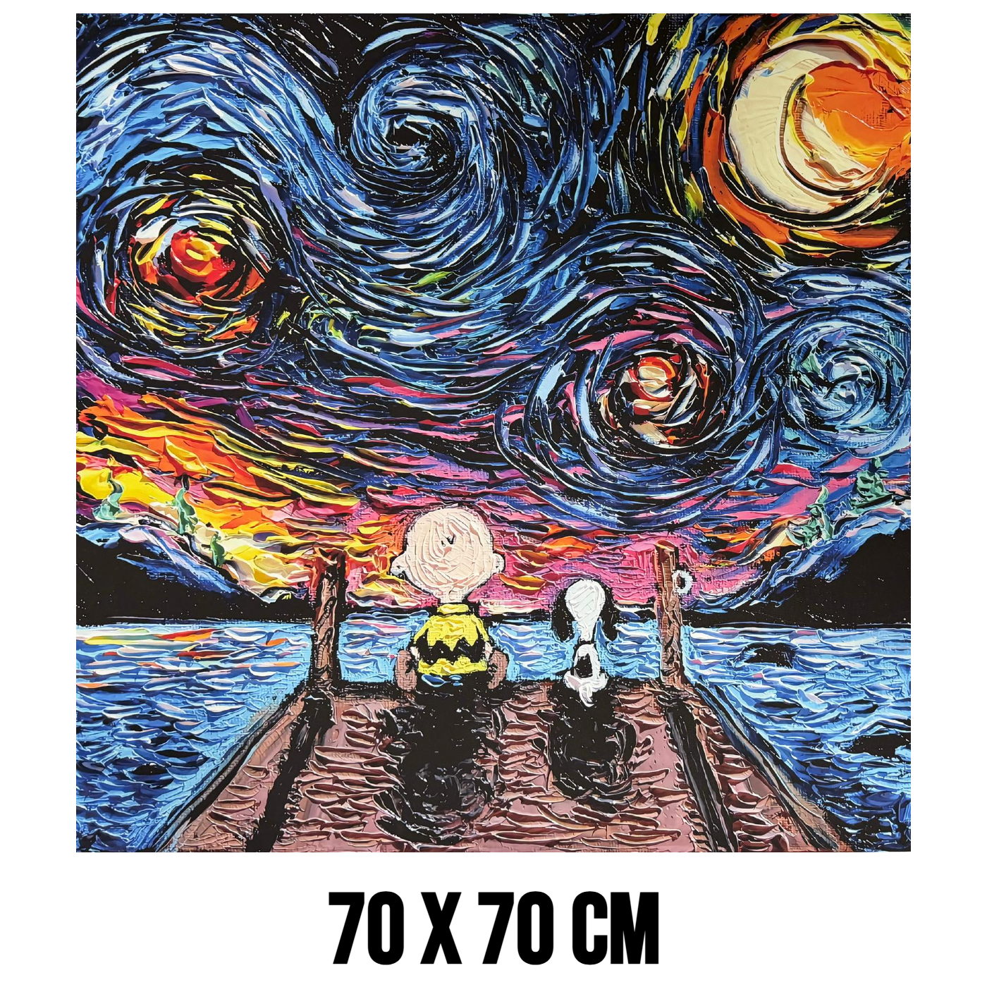 In de voorgrond van het kunstwerk staan de bekende cartoonhond en jongen met een karakteristiek gestreept shirt afgebeeld. Samen zitten zij onder de indrukwekkende sterrenhemel aan het water. Deze eenvoudige maar ontroerende scène geeft het schilderij een rustige en nostalgische sfeer. Het gevoel van vriendschap en rust maakt dit cartoon kunst canvas bijzonder warm en uitnodigend.