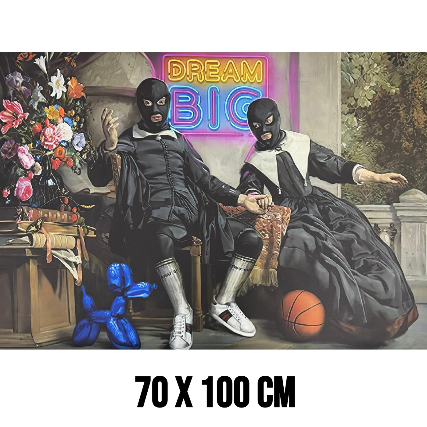 Wat dit schilderij extra bijzonder maakt, zijn de moderne details die in het ontwerp zijn verwerkt. In het kunstwerk zijn onder andere een basketbal en sneakers te zien, wat zorgt voor een opvallend contrast met de historische kleding. Hierdoor ontstaat een krachtige mix van oud en nieuw die perfect past bij hedendaagse urban art canvas en moderne interieurstijlen.