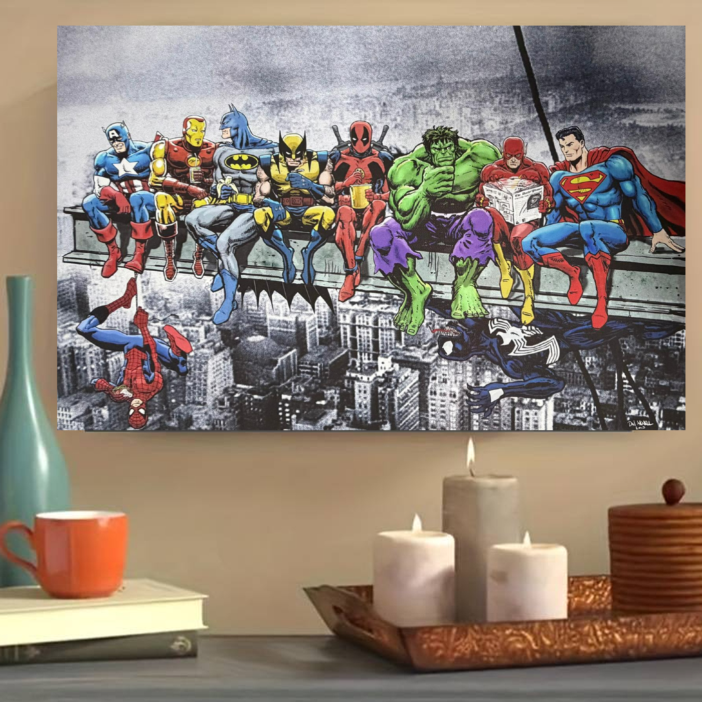 Dit canvas schilderij toont een speelse en gedetailleerde scène waarin verschillende superhelden ontspannen naast elkaar zitten, alsof ze pauze nemen tijdens een werkdag op grote hoogte. De combinatie van actiehelden en een klassiek beeld zorgt voor een verrassend en humoristisch effect dat direct opvalt.
