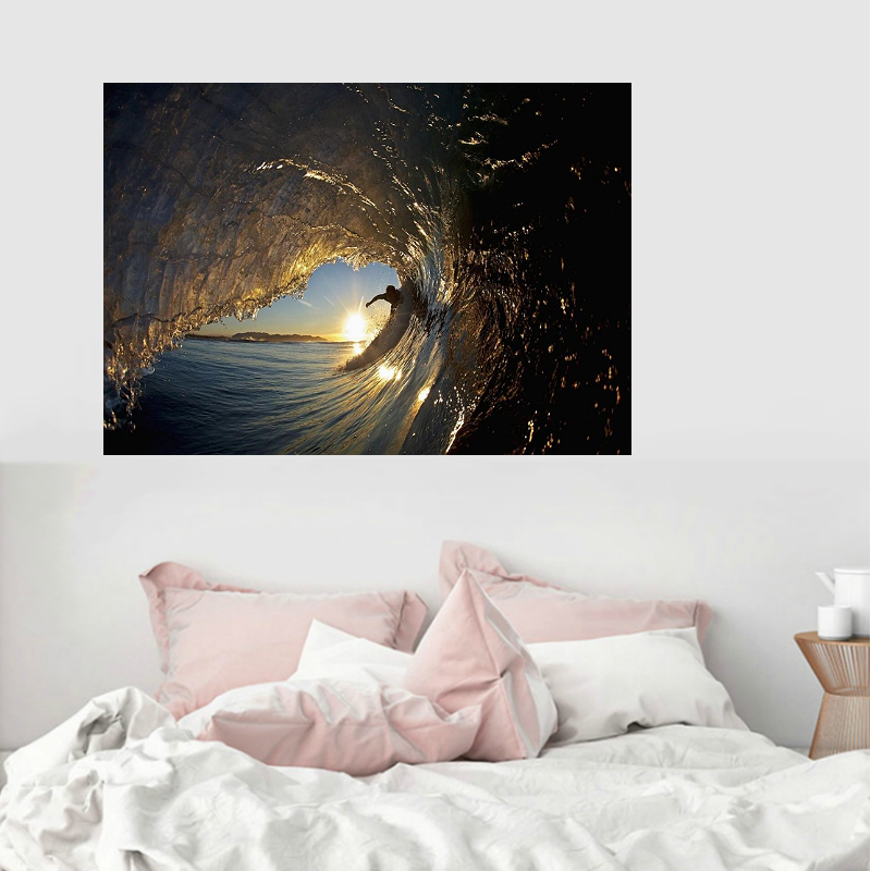 Canvas Schilderij * Surfer in een Golf bij Zonsondergang * - Surfsport - Print - Kleur - 50 x 70 cm