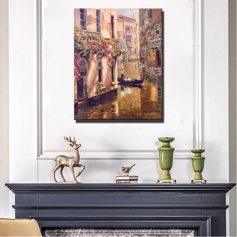Allernieuwste.nl® Canvas Schilderij Venetië Stad en Gondel - Kunst aan je Muur - Romantisch Realistisch - Kleur - 50 x 70 cm