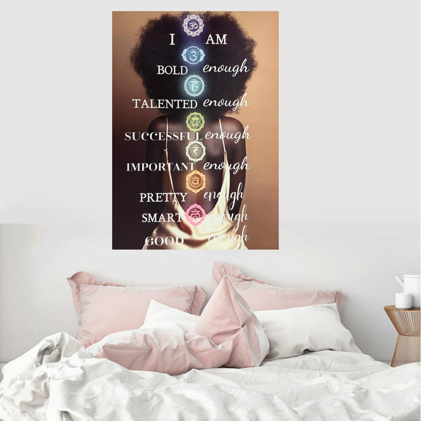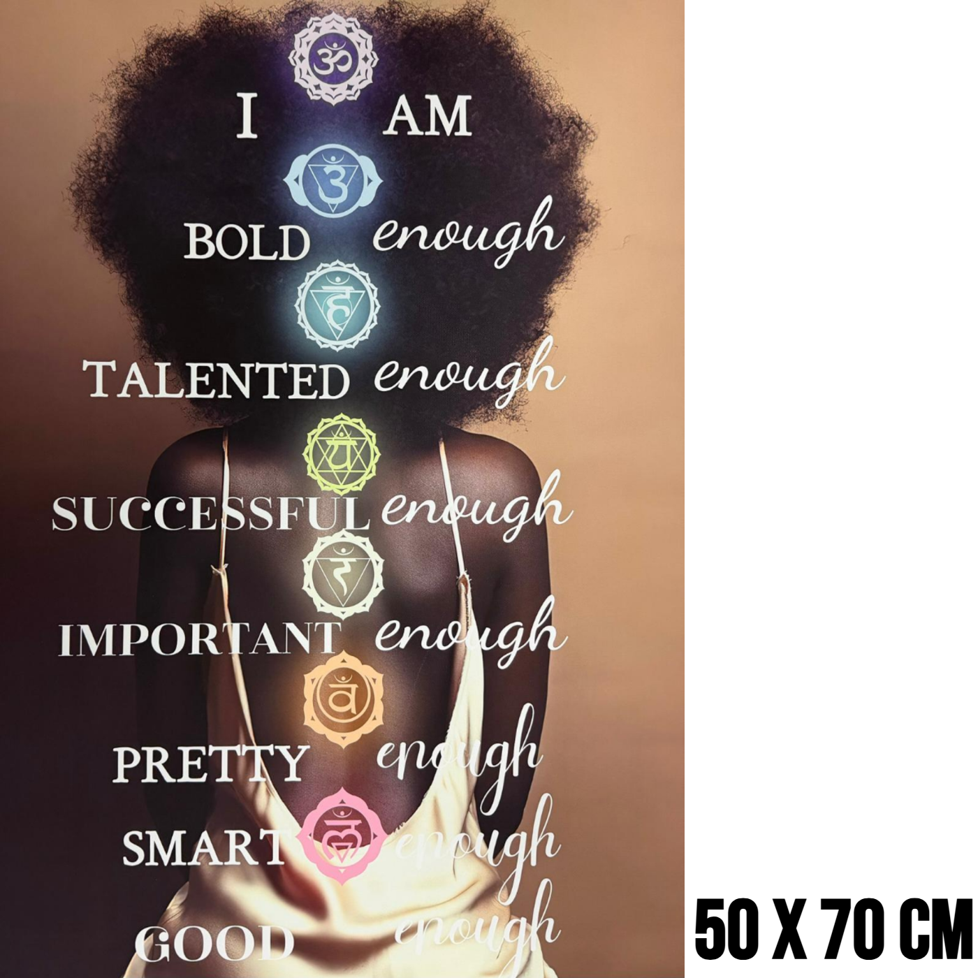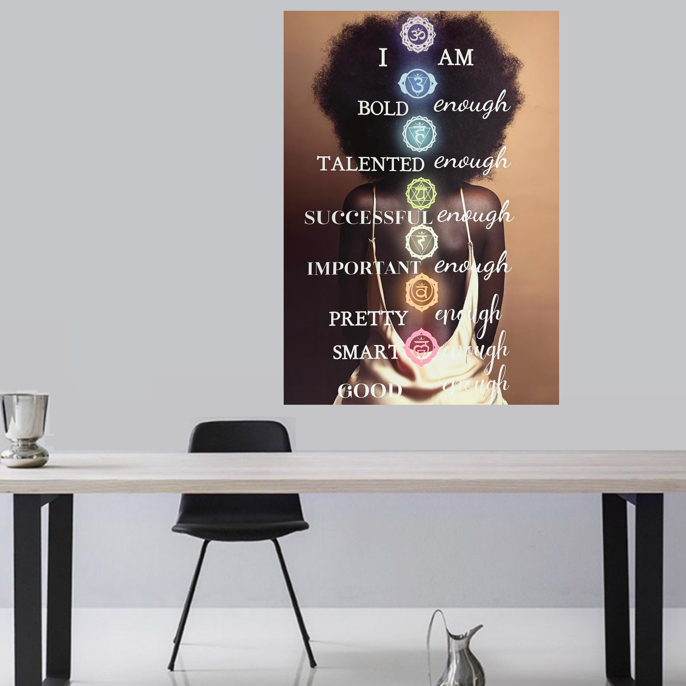 Dit kunstwerk combineert visuele schoonheid met betekenisvolle energie. De chakra symbolen worden weergegeven in hun karakteristieke kleuren, van de wortelchakra tot de kruinchakra, en staan symbool voor balans tussen lichaam, geest en ziel. Naast elk chakra staat een inspirerende affirmatie in het Engels, zoals “I AM BOLD enough” (Ik ben gedurfd genoeg), “I AM SMART enough” (Ik ben slim genoeg) en “I AM PRETTY enough” (Ik ben mooi genoeg). Deze woorden moedigen aan tot zelfacceptatie en versterken het zelfvertrouwen dagelijks.