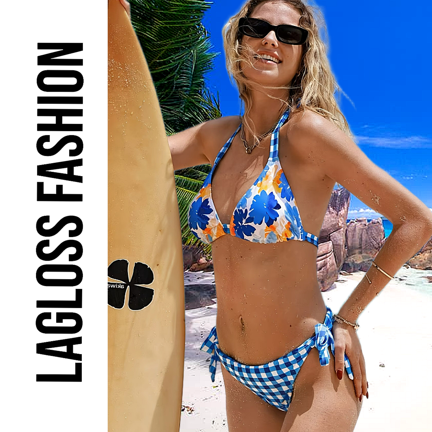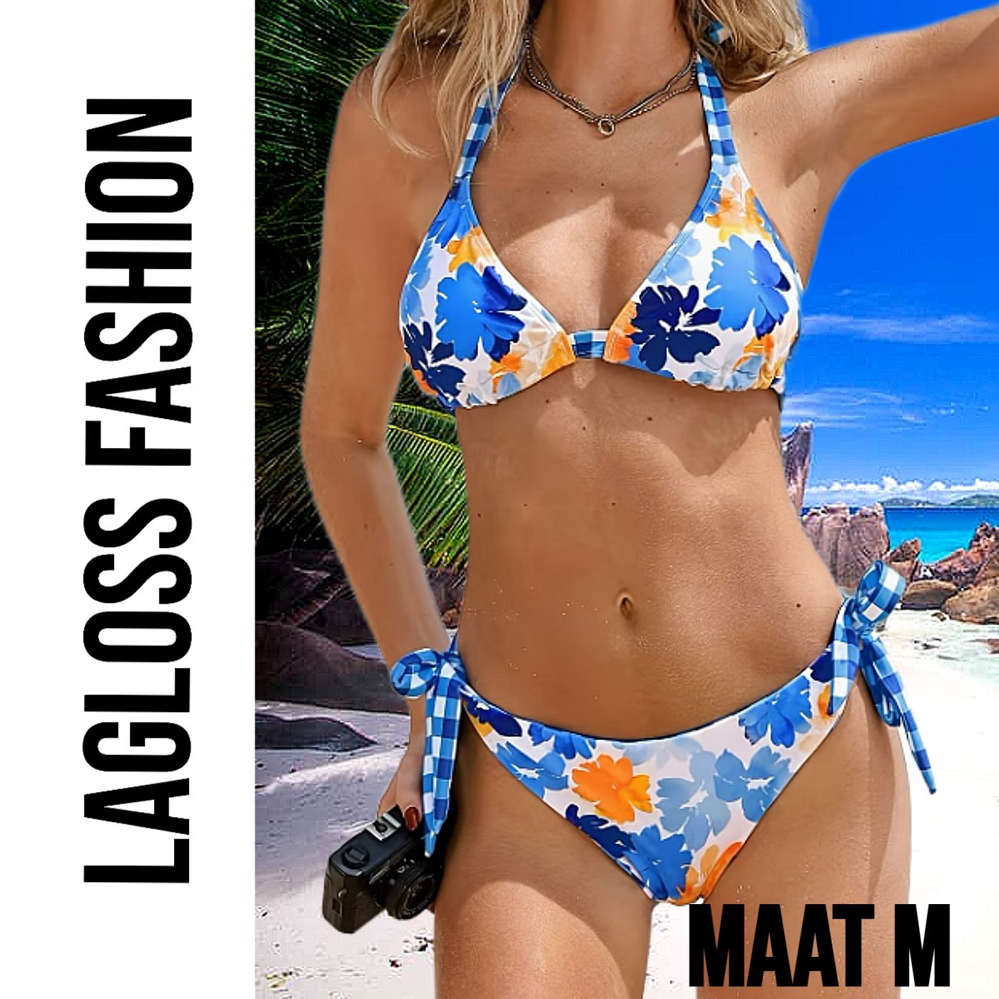 Wat deze bikini extra bijzonder maakt, is het omkeerbare broekje. U kunt kiezen tussen een tropische bloemenprint of een stijlvolle blauwe blokjesprint. Hierdoor krijgt u eigenlijk twee looks in één, wat deze omkeerbare bikini perfect maakt voor vakanties en afwisseling. De zijbandjes zorgen voor een speelse en vrouwelijke uitstraling en maken deze bikini met zijbandjes extra trendy.