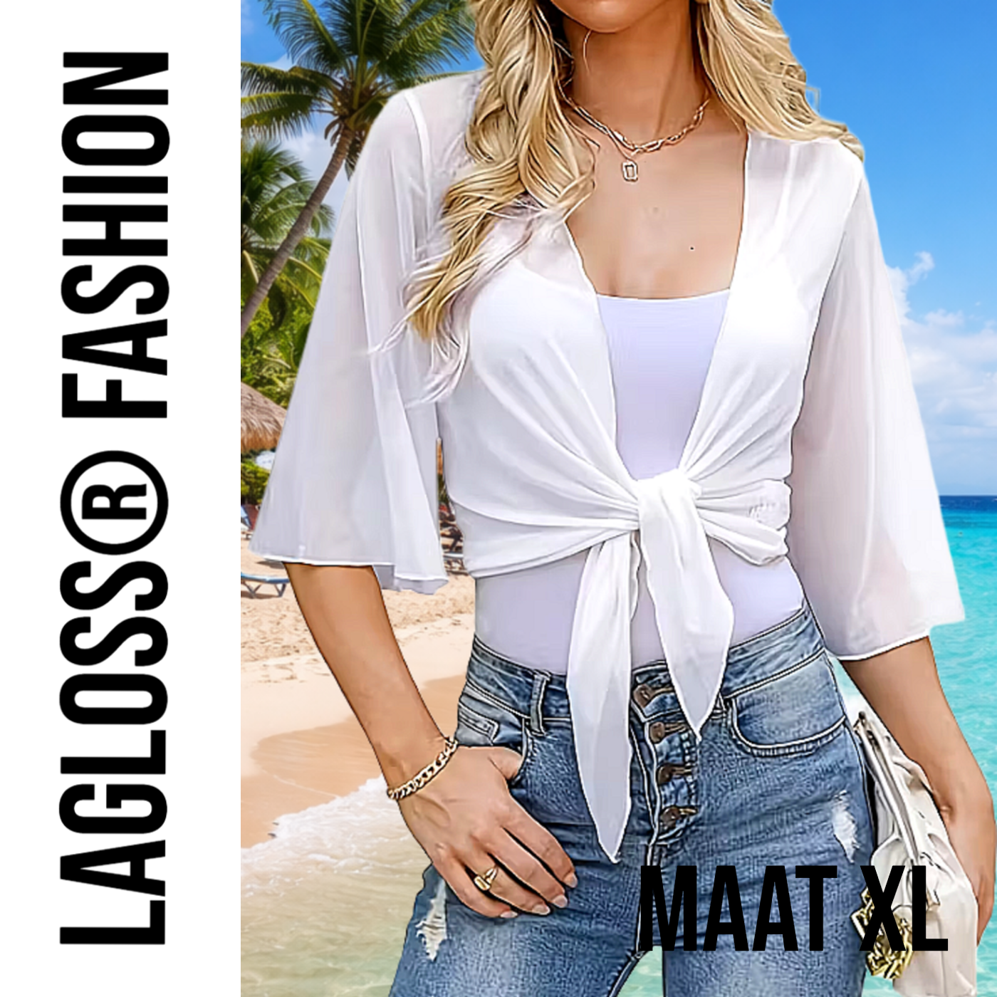 LaGloss® Dames Cardigan V-Hals Vest Wit – Lichtgewicht Zomer Vest – Luchtig – Driekwart mouw – Maat XL