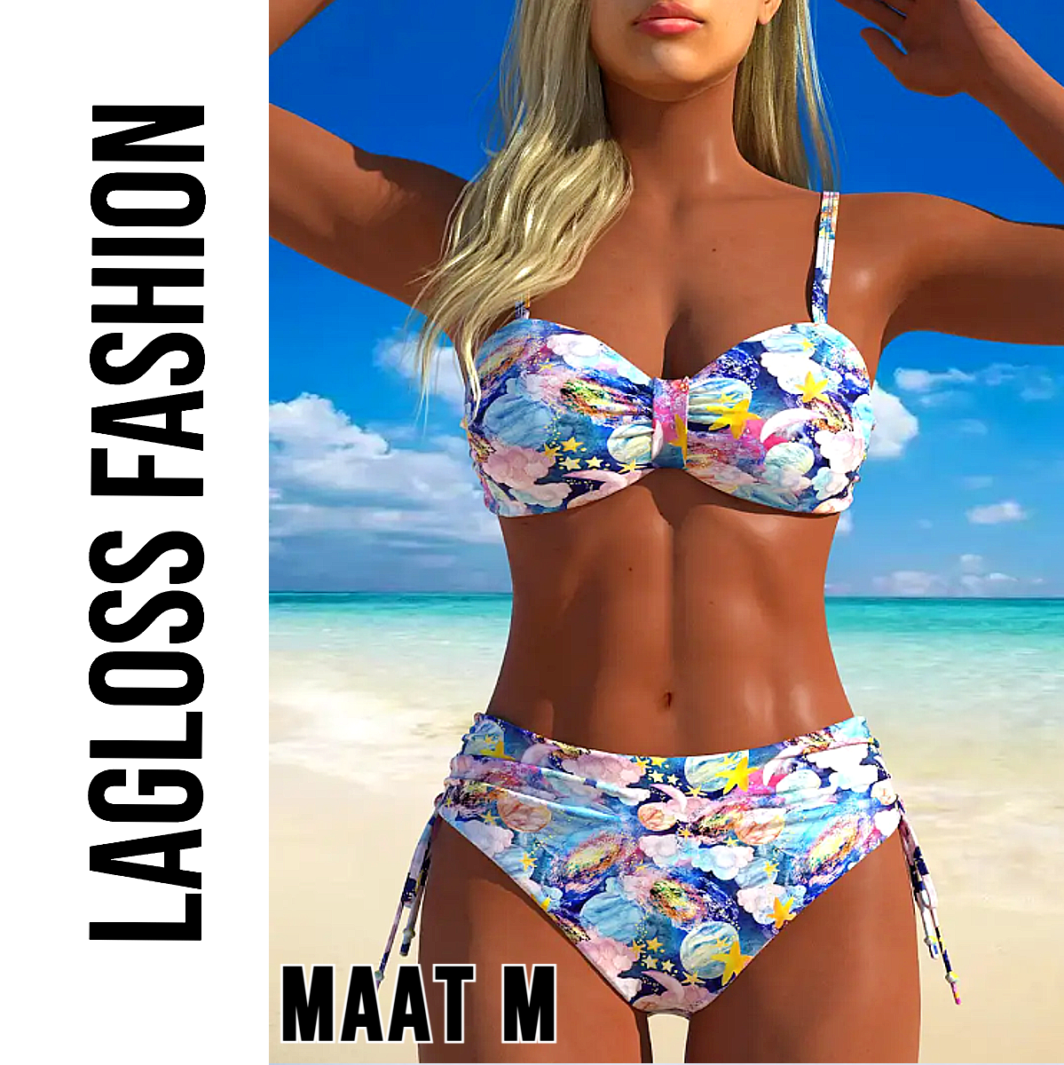 LaGloss® Dames Hoge Taille Bikini Set – Bloemenprint & Buikcontrole – Blauw/Wit Tweedelig Badpak – Rekbare Stof – Maat M