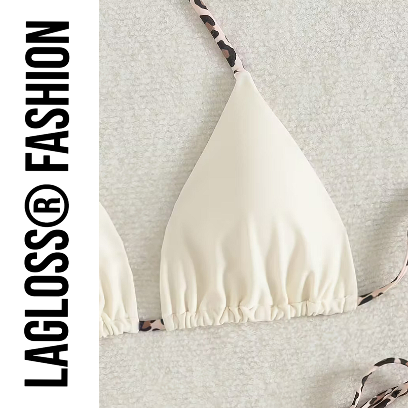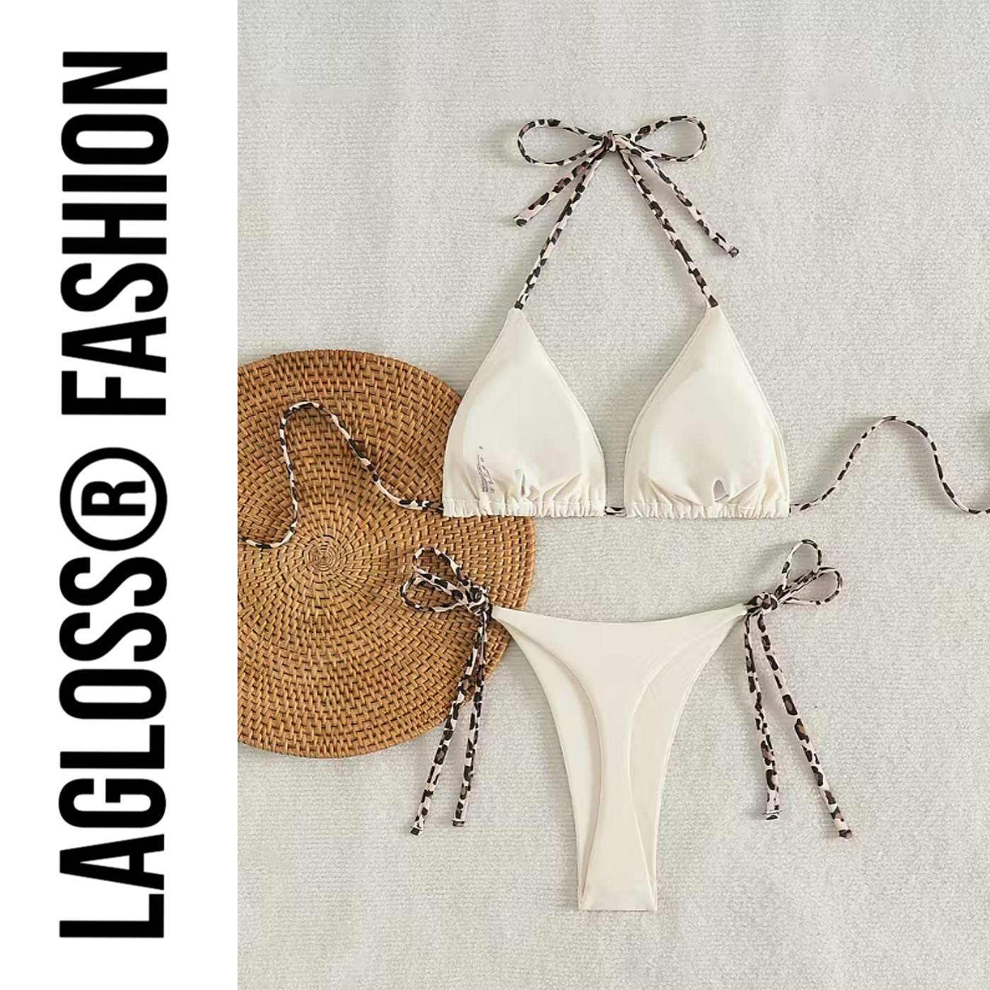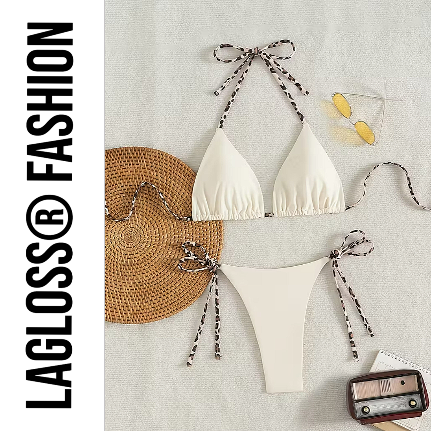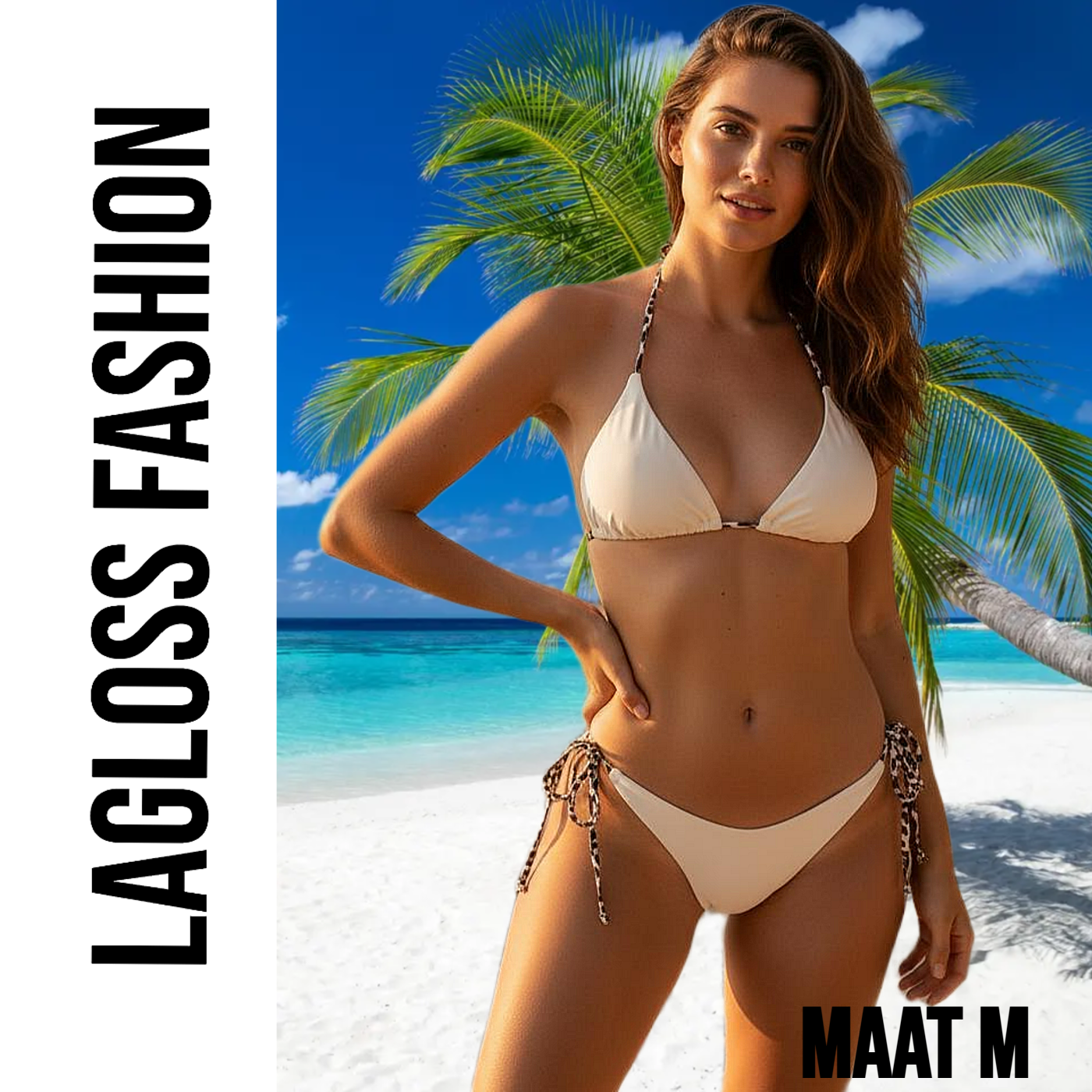 LaGloss® Dames Melkkleurige Bikini Set met Luipaardprint Bindkoorden - Halter Top – String Broekje – Low Waist – Zomer – Beach Fashion – Maat M