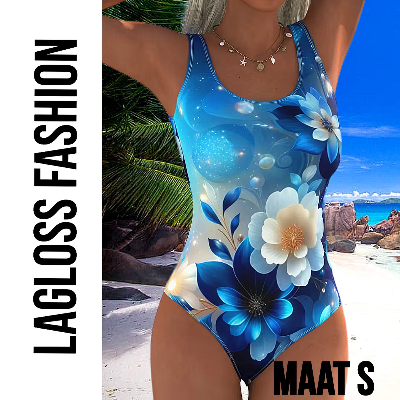 LaGloss® Eendelig Blauw-Witte Bloemen Dames Badpak met Open Rug - Sexy Zwempak – Badkleding – Strandmode – Beach Fashion – Maat S