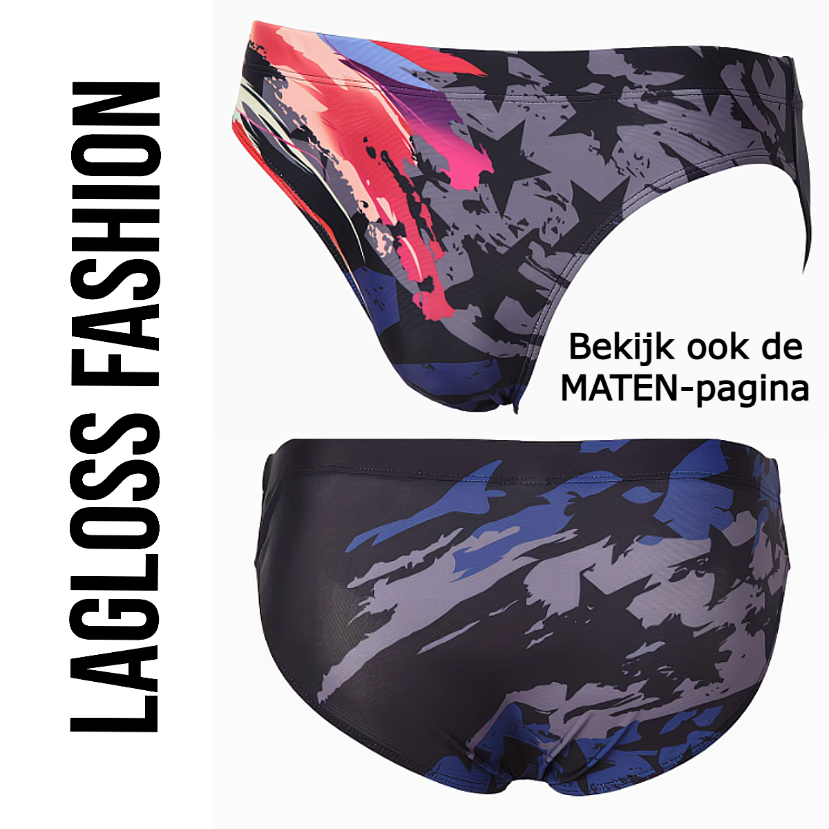 Wat deze zwembroek echt bijzonder maakt, is het unieke kleurenspel. In één en dezelfde zwemslip zijn verschillende stijlen gecombineerd. De bovenkant en één zijde bevatten opvallende neonkleuren zoals roze, rood en blauw voor een energieke uitstraling. Aan de andere zijde vindt u een rustiger gedeelte met grijs en subtiele sterdetails. De onderzijde bestaat uit donkerblauwe tinten met sterren, wat zorgt voor een stijlvol contrast. De achterkant combineert blauw, grijs en zwart, waardoor deze trendy zwemslip heren vanuit elke hoek een unieke look heeft.