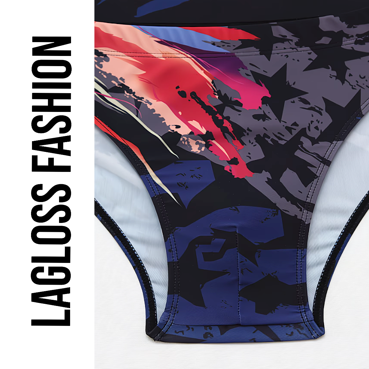 Wat deze zwembroek echt bijzonder maakt, is het unieke kleurenspel. In één en dezelfde zwemslip zijn verschillende stijlen gecombineerd. De bovenkant en één zijde bevatten opvallende neonkleuren zoals roze, rood en blauw voor een energieke uitstraling. Aan de andere zijde vindt u een rustiger gedeelte met grijs en subtiele sterdetails. De onderzijde bestaat uit donkerblauwe tinten met sterren, wat zorgt voor een stijlvol contrast. De achterkant combineert blauw, grijs en zwart, waardoor deze trendy zwemslip heren vanuit elke hoek een unieke look heeft.
