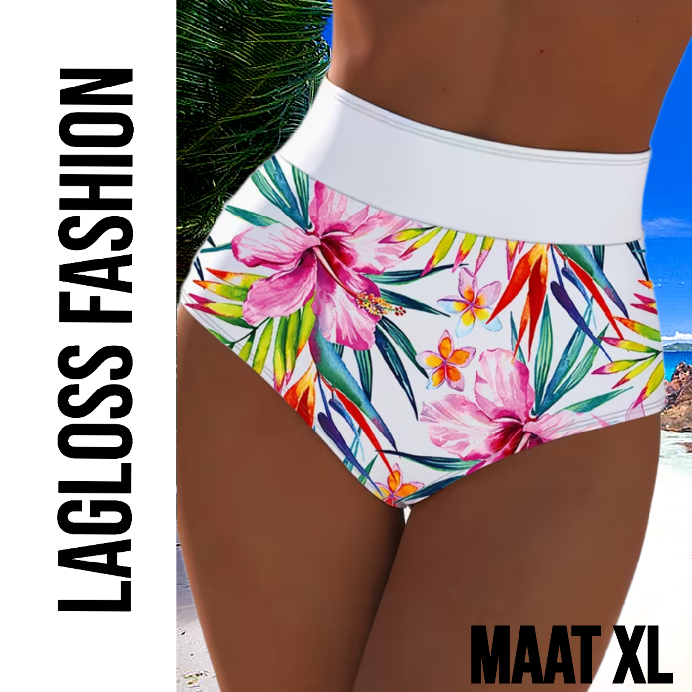 LaGloss® High Waist Dames Bikini Broekje met All-over Bloemenprint Wit - Hoog Elastisch – Zomermode – Beach fashion – Maat XL