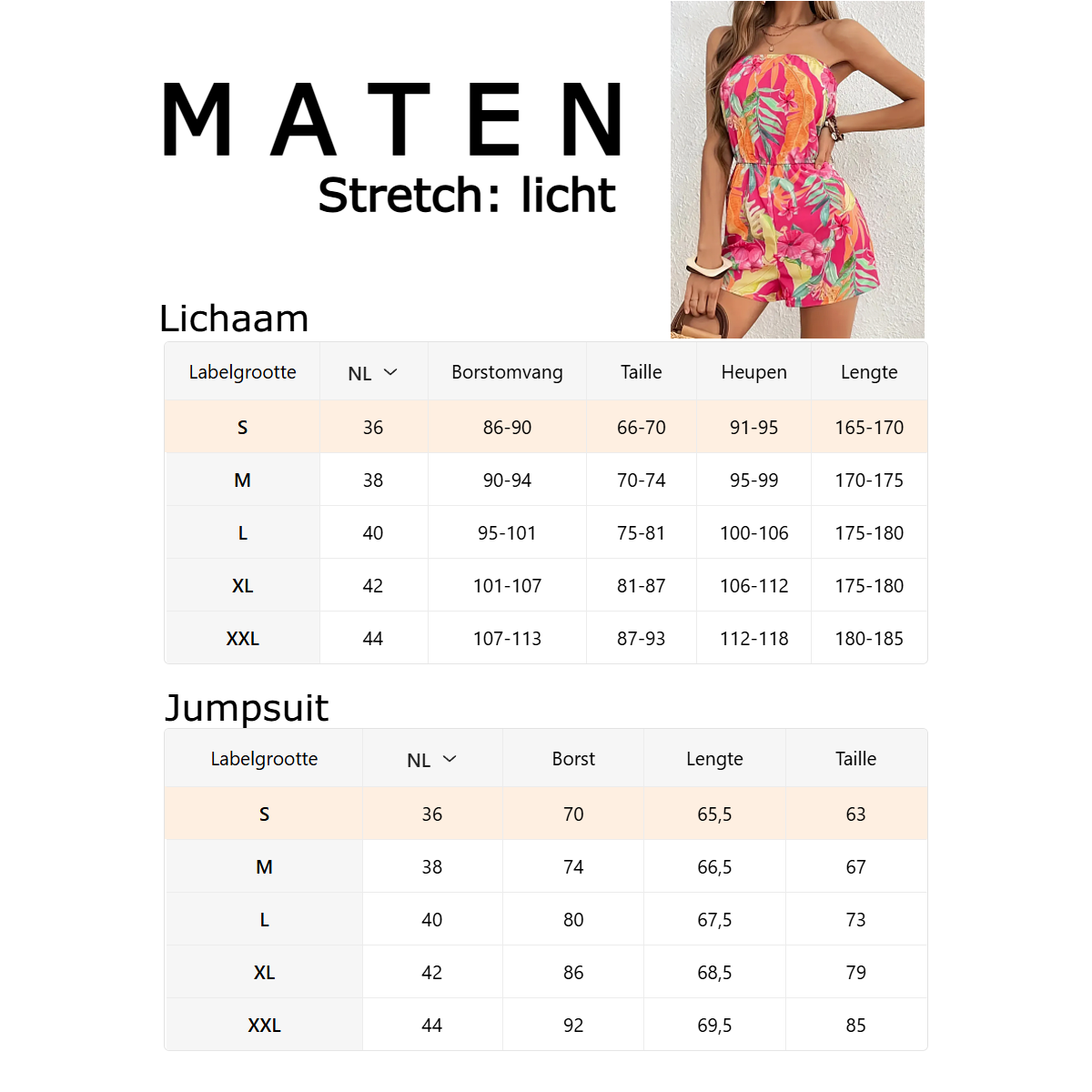 Met een charmant strapless ontwerp en een flatterende hoge taille biedt deze jumpsuit een moeiteloze elegantie die perfect past bij zomerse vibes. De delicate bloemenprint voegt een vleugje vrouwelijkheid toe, terwijl de luchtige pasvorm je koel en comfortabel houdt, zelfs op de warmste dagen.